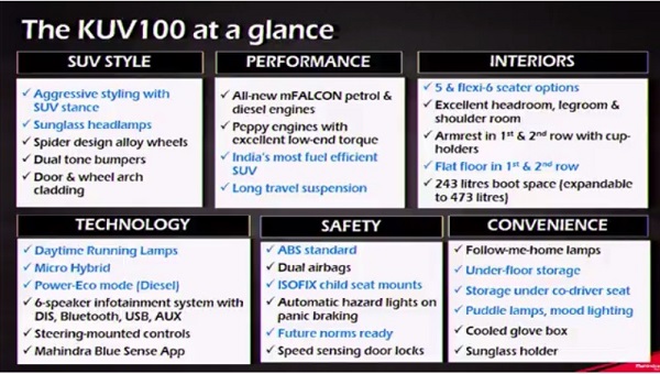 Mahindra today launched the much awaited compact SUV KUV100 (pronounced as KUV ‘1 double Oh’) at price range of Rs 4.42 lakh – Rs 6.76 lakh ex-showroom, pune.