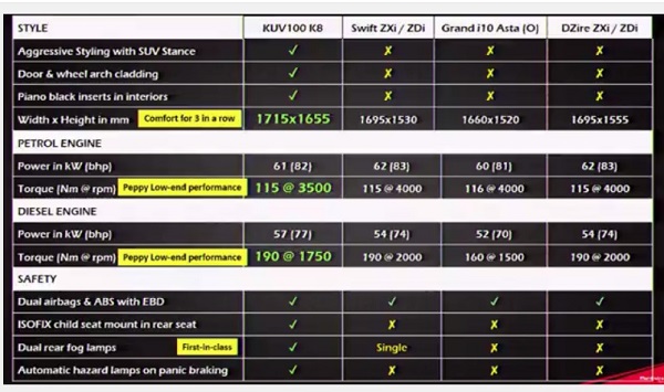 Mahindra KUV100 is also the first ever sub-compact SUV in India with 6-seat configuration, though there will be a 5-seat version as well on offer. Mahindra says the 6-seat is just for point of difference or rather a power of choice without any compromise for safety.
