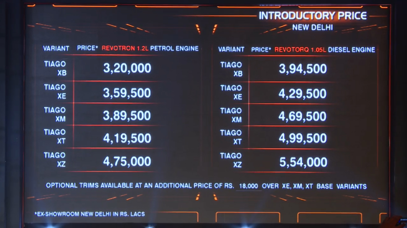 After several delays and a name change, Tata Motors has finally launched the much awaited Tiago hatchback at Rs 3.20 lakhs ex-showroom, Delhi. Based on the XO platform, the Tiago is an all new offering from Tata Motors after Nano. The Tiago will be offered in 5 trims namely XB, XE, XM, XT and XZ below are the prices. All prices ex-showroom, Delhi. Optional trims will be available as well. Tata has positioned the Tiago in the mid-upper segment.