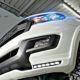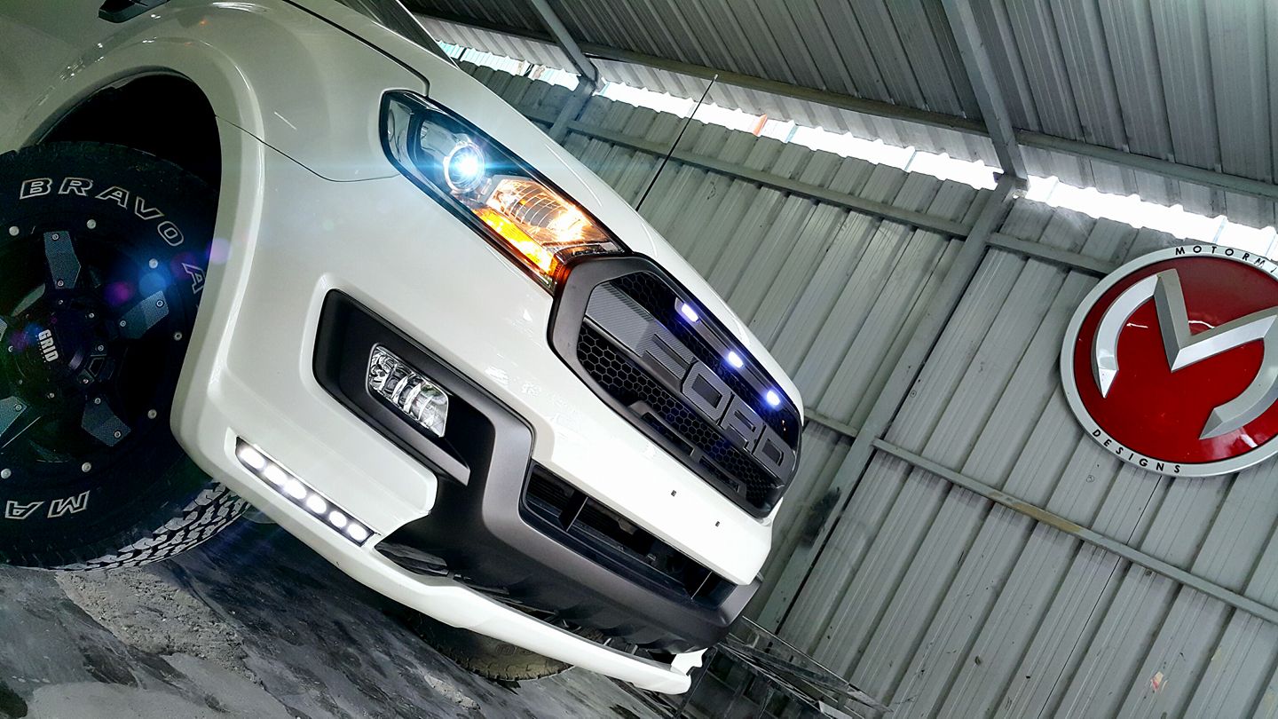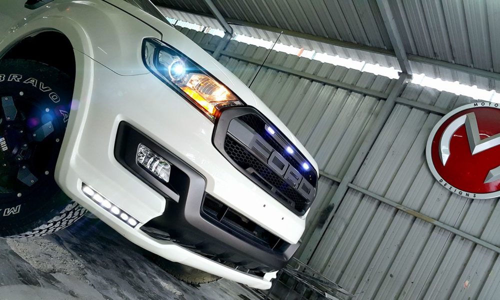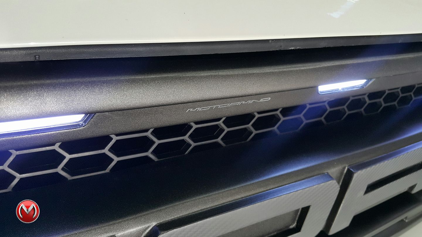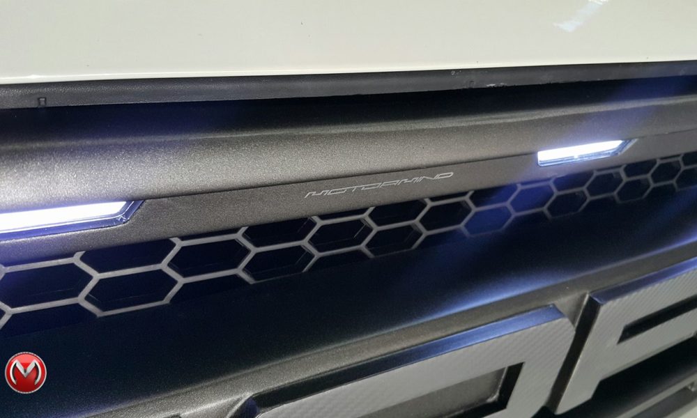 At front, there is a custom grille à la Ford Raptor, which appears to be made out of carbon fibre, and 3 LED lights in a strip positioned at the top. Notice the blacked-out headlamp clusters.