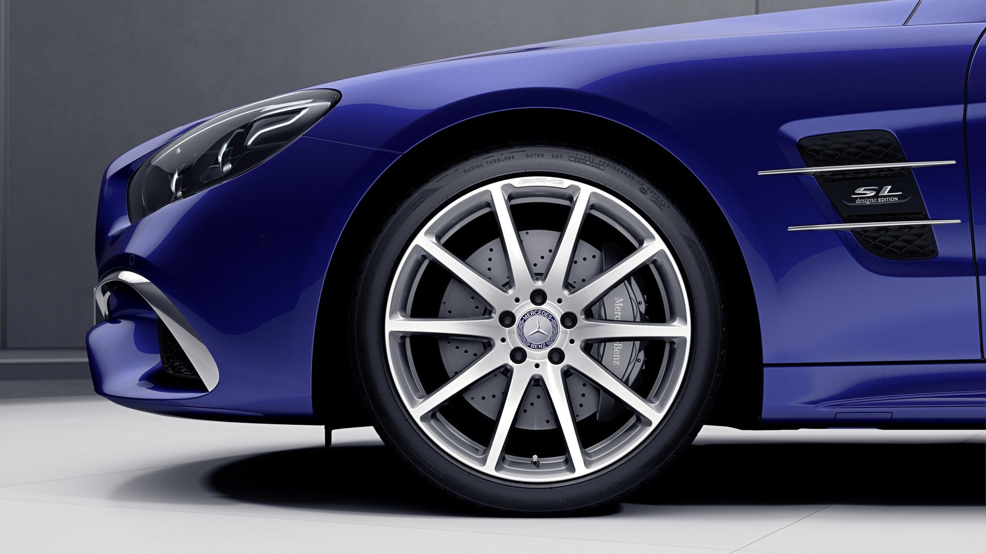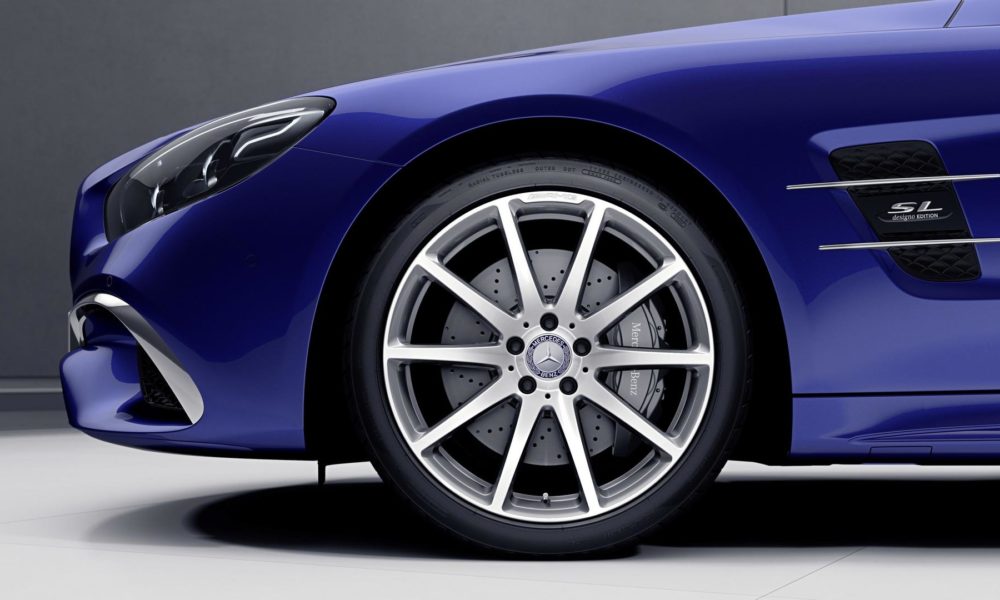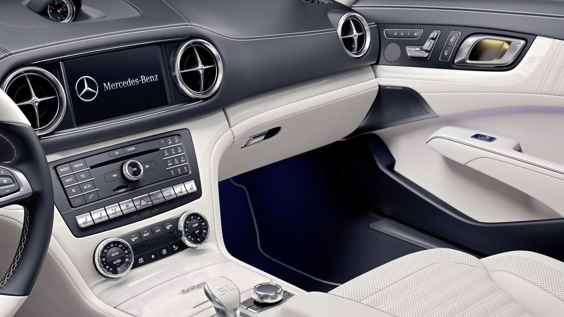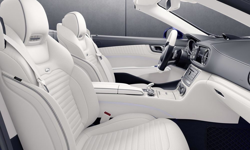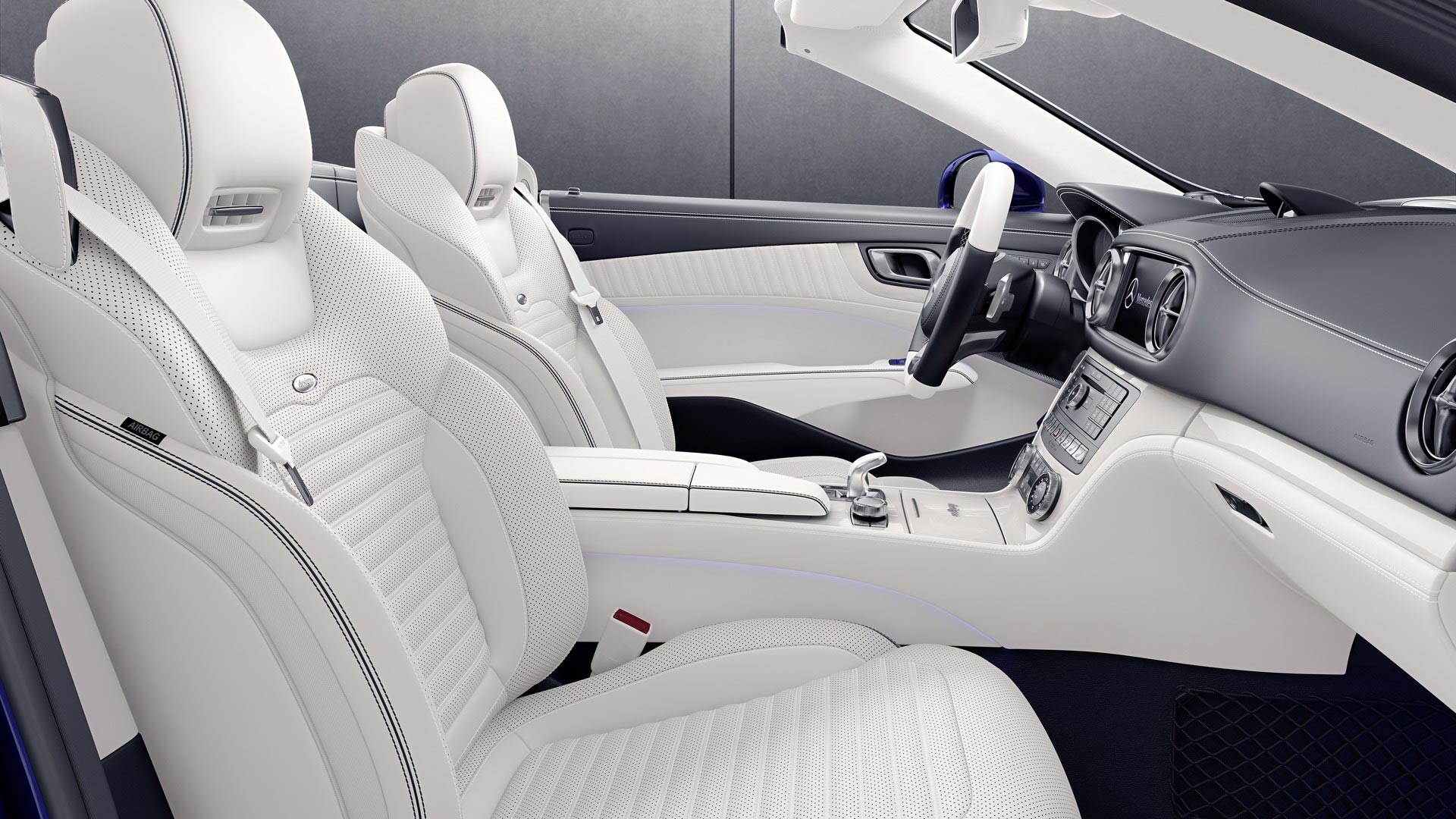 The SL designo Edition on the other hand gets brilliant blue finish, 19- or 20-inch AMG 10-spoke forged wheels, designo Edition badge, and chrome flics in the front apron ensure a special exterior look. On the inside, seats and door centre panel get porcelain/black designo Nappa leather with exclusive designo layout, roof liner in porcelain designo DINAMICA and designo seat belts in white. Further matching appointments include the ambient lighting, the 3-spoke two-tone multifunction sports steering wheel in black/porcelain nappa leather, the DIRECT SELECT selector lever in porcelain leather, the designo trim element in piano lacquer champagne white as well as the floor mats with porcelain designo badges and edging.