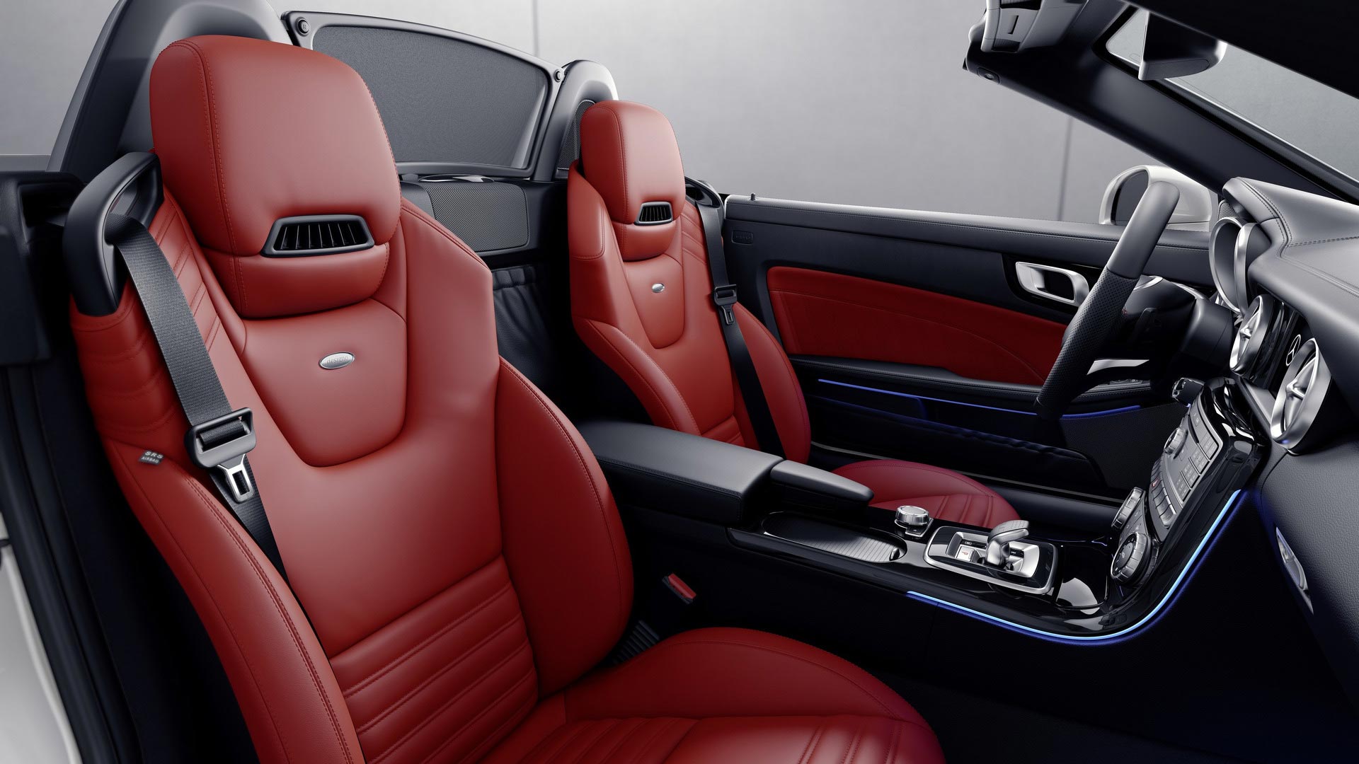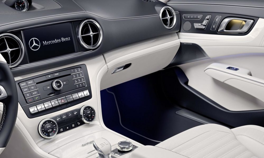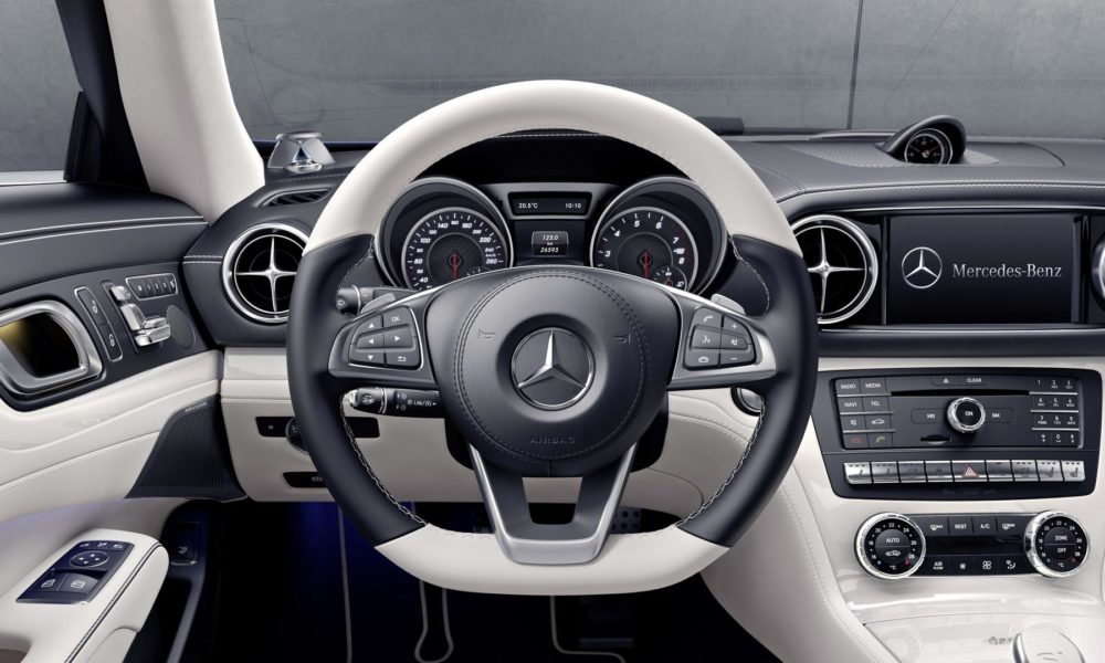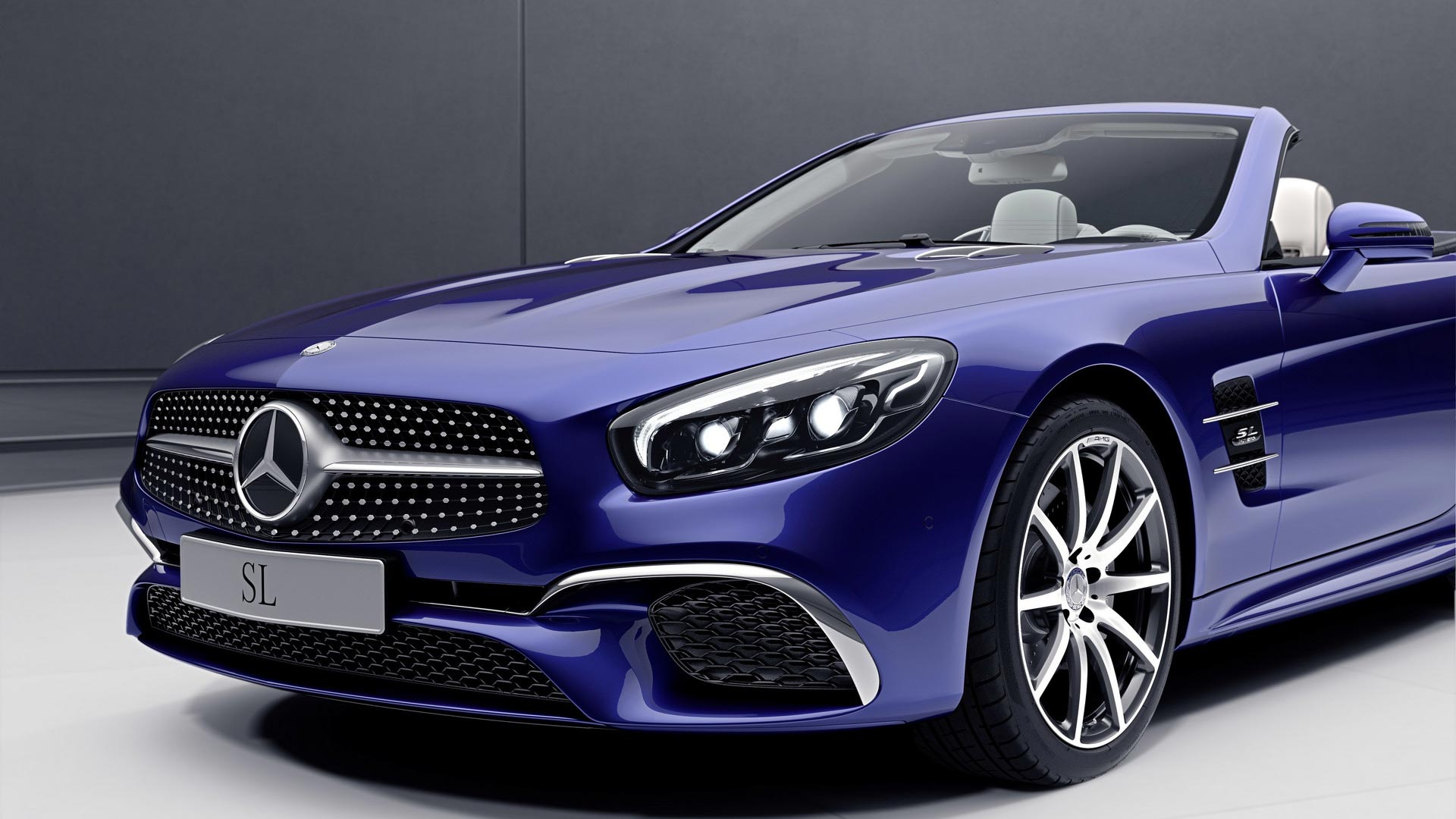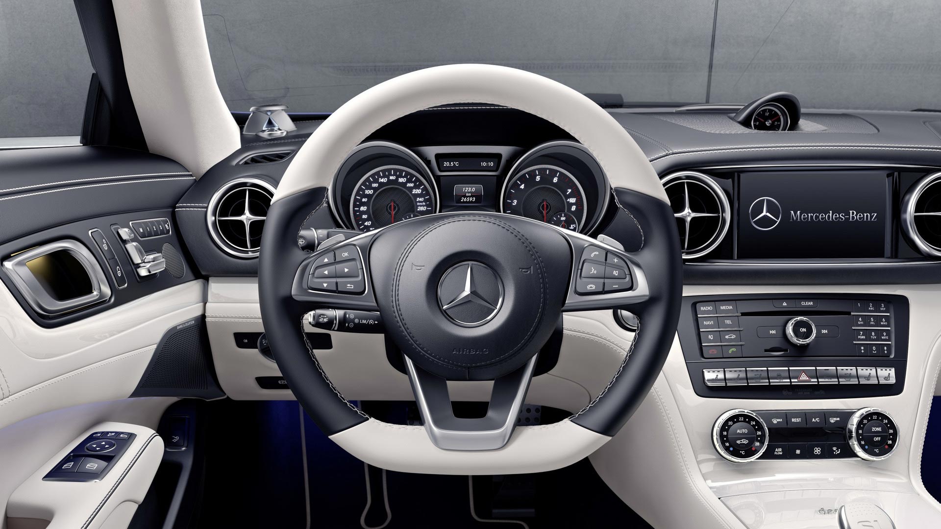 The SL designo Edition on the other hand gets brilliant blue finish, 19- or 20-inch AMG 10-spoke forged wheels, designo Edition badge, and chrome flics in the front apron ensure a special exterior look. On the inside, seats and door centre panel get porcelain/black designo Nappa leather with exclusive designo layout, roof liner in porcelain designo DINAMICA and designo seat belts in white. Further matching appointments include the ambient lighting, the 3-spoke two-tone multifunction sports steering wheel in black/porcelain nappa leather, the DIRECT SELECT selector lever in porcelain leather, the designo trim element in piano lacquer champagne white as well as the floor mats with porcelain designo badges and edging.