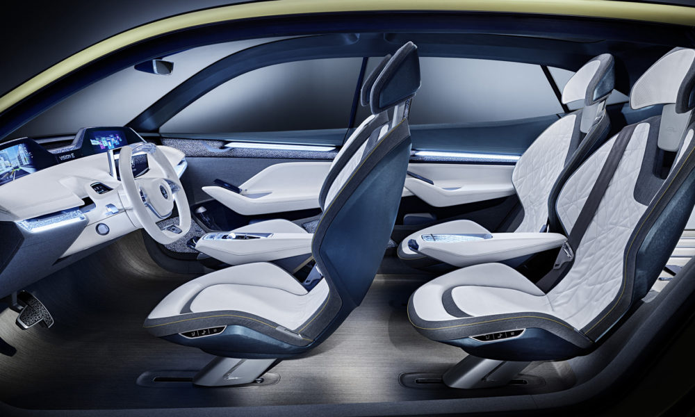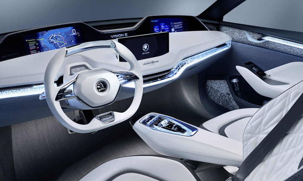The Skoda Vision E is built on VW Group’s MEB (modular electrification toolkit) platform. With its two electric motors, the power output is rated at 225 kW (302 hp), and can achieve a top speed of 180 km/h. The electric motors permanently drive all four wheels. The lithium-ion batteries and brake energy recovery enable a range of up to 500 km. The Vision E also features inductive charging via a floor panel in the owner’s garage. Quick charging is also possible, 80 percent of battery capacity in just 30 minutes.