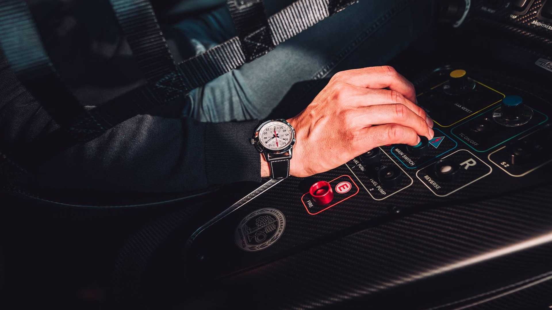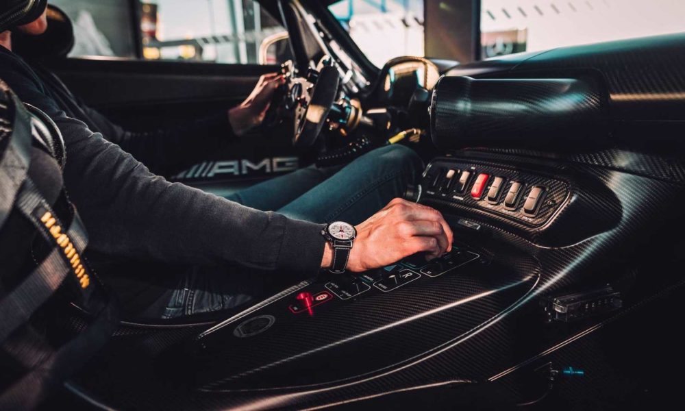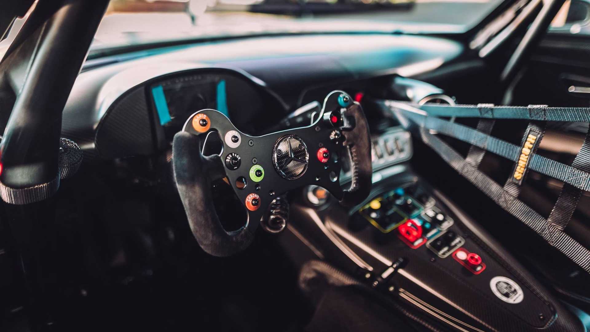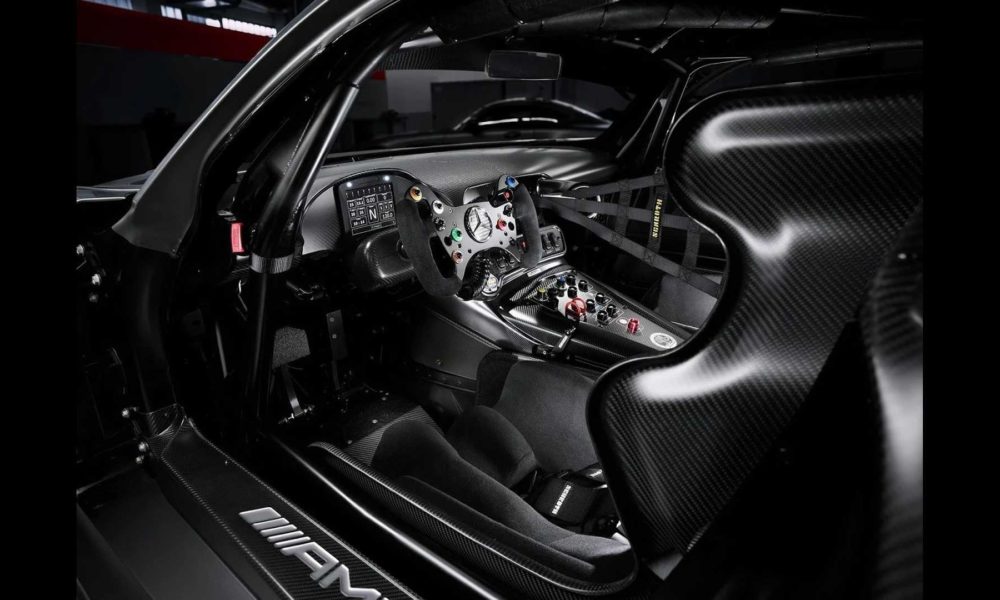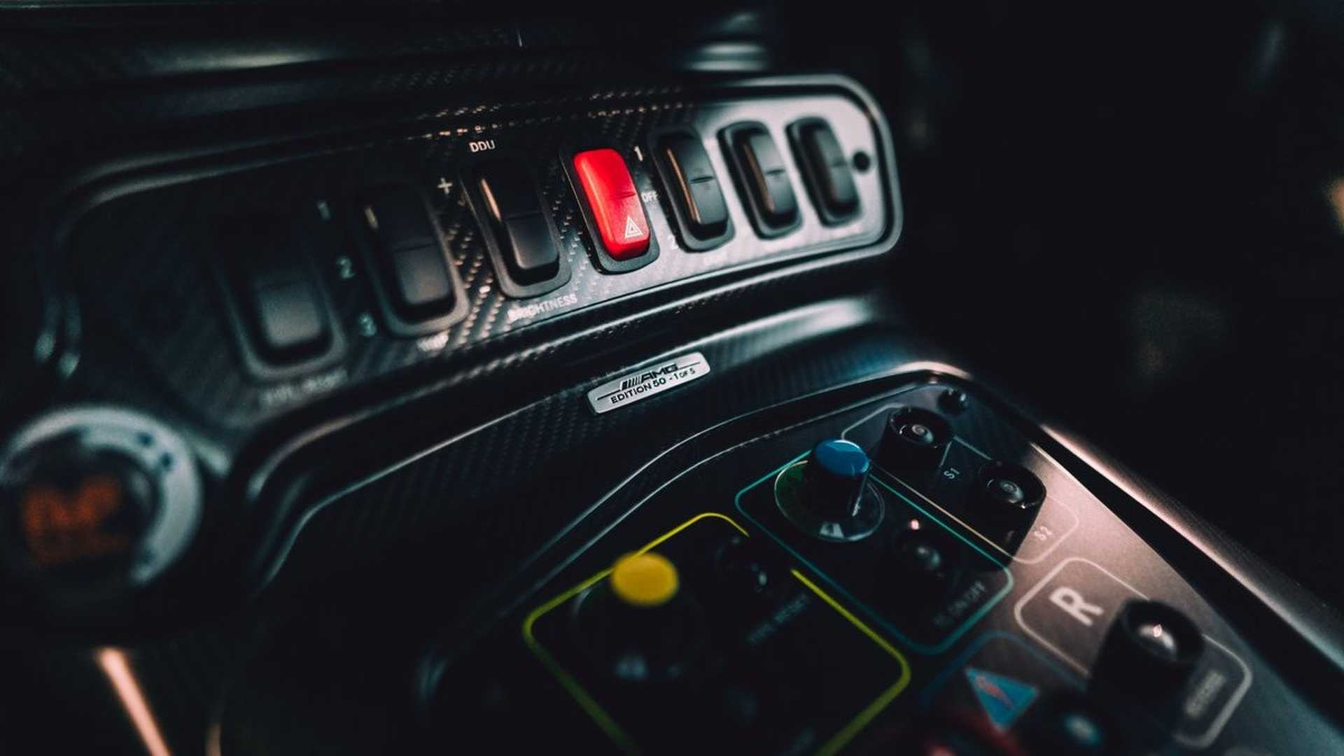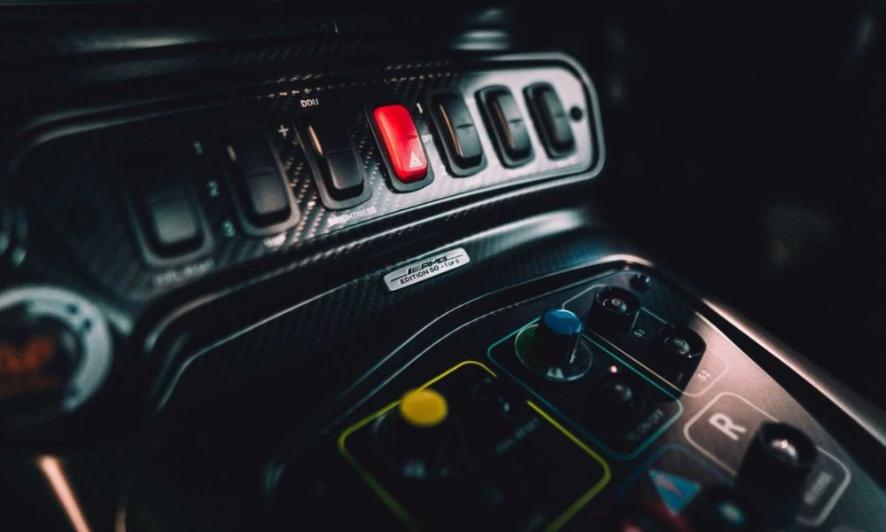 The roll cage, as well as the visible floor assembly, are painted in this special colour real black. Dashboard, sills, door panels, vent pipe and centre console are styled in matt black carbon fibre. Silver-coloured six-point seat belts and the racing steering wheel in silver form an essential contrast. The collector’s item also has a seat shell in high-strength carbon-fibre for safety. The seat belts also bear the “50 Years of Driving Performance” logo with a silver surround. Further fine details include the AMG logos in the doors and sill, and the “Edition 50 -1 of 5” badge.