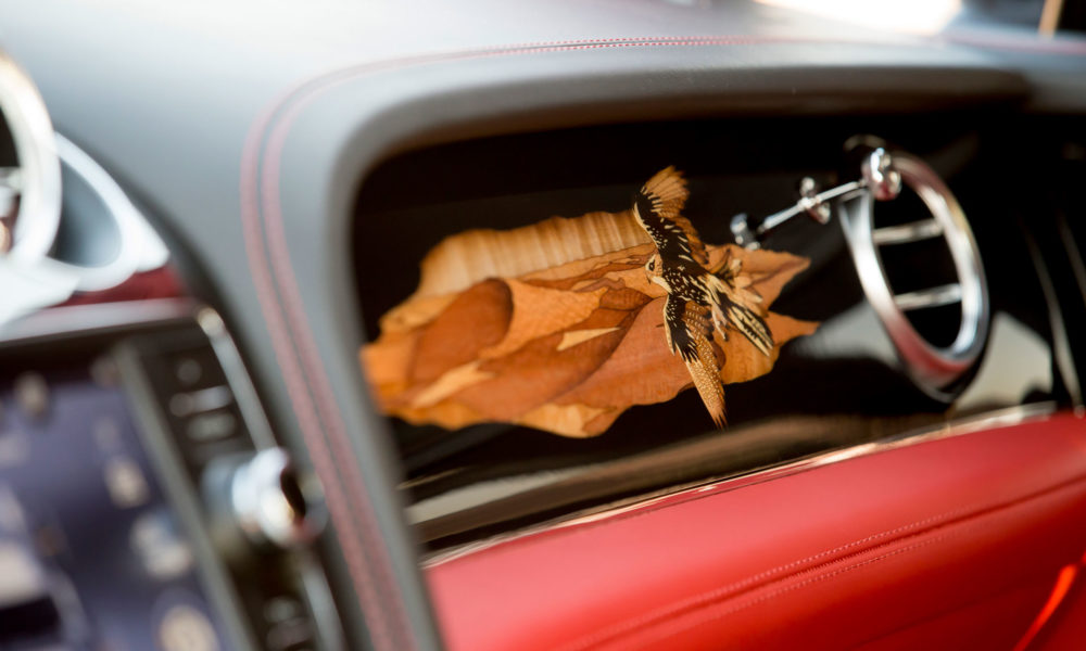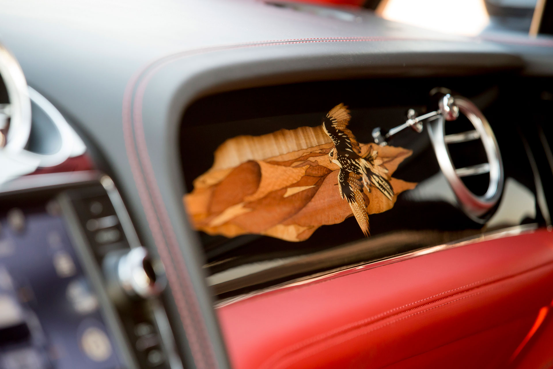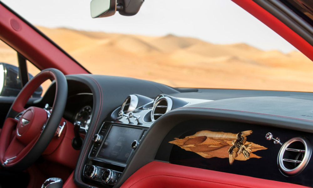 While the exterior looks like any other Bentayga, the interiors follow the falconry theme as well. Inside the Bentayga’s Hotspur-hide-trimmed cabin, there is a removable transportation perch and tether on the central armrest. Bentley says the sweeping desert scene featuring a soaring saker falcon was created using 430 individual pieces of wood sourced from all over the world and hand-crafted over nine days.