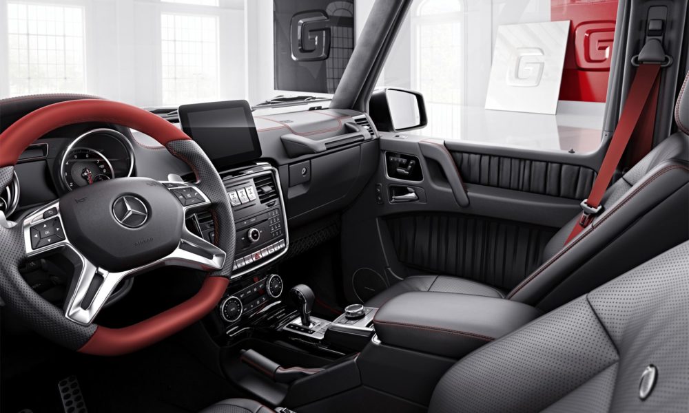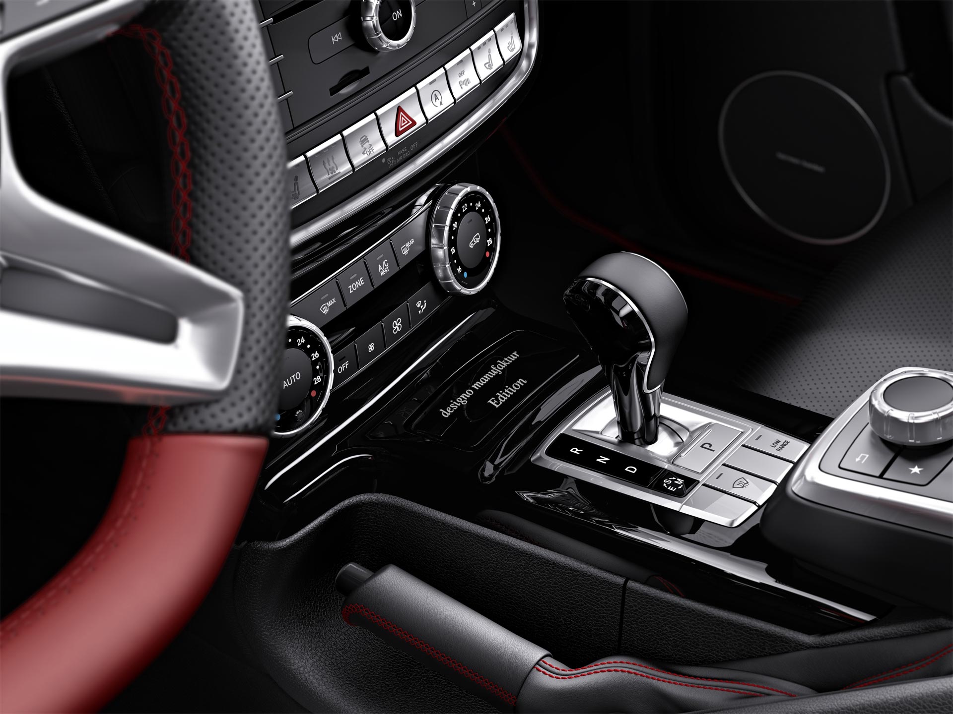 The interior of the G-Class designo manufaktur Edition has sporty highlights in black designo nappa leather with colour-coordinated red topstitching. The AMG Performance steering wheel has the same colour combination, the two-tone rim is in classic red/black. Black leather grab handles in the roof liner and the exclusive ‘designo manufaktur Edition’ badge on the centre console round off the overall package.