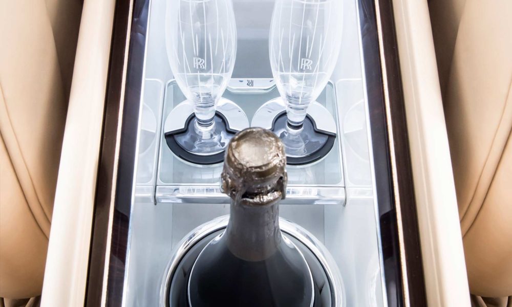 There’s an interesting feature in this one-off. The entire centre console houses a mechanism that, at the touch of a button, will deploy a bottle of the client’s favourite vintage champagne and two crystal champagne flutes. As the lid of the chiller opens, the mechanical action articulates the bottle to the perfect position for the owner to pick up.