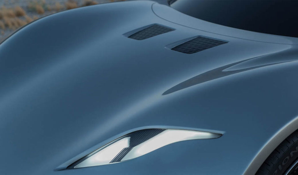 The front end’s aluminium centerpiece houses a LIDAR system. Side mirrors conceal two cameras, which enable panoramic, 360-degree views to the driver.