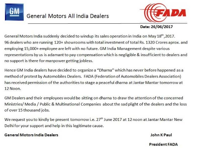 It looks like GM India’s troubles are far from over. The dealers who were upset about the insufficient compensation, are now organizing a peaceful ‘dharna’ at Jantar Mantar, New Delhi, today at 12 noon.