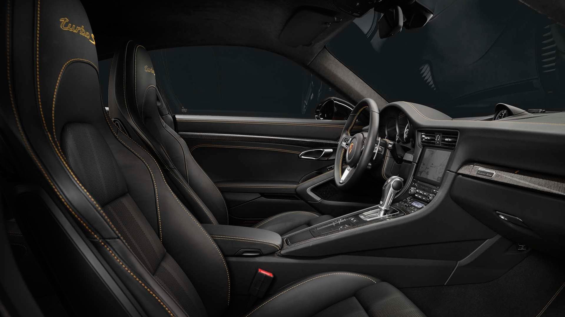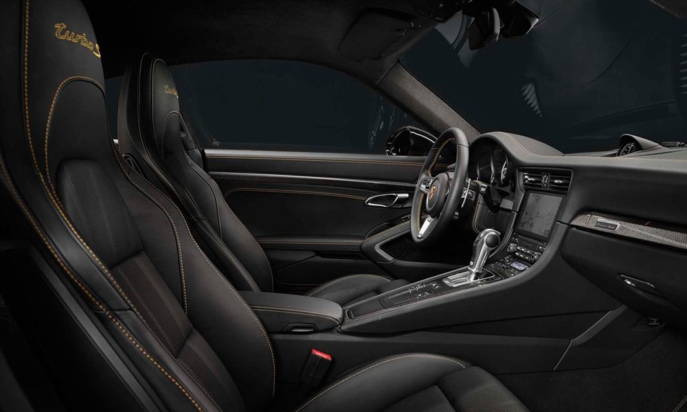 Interiors follow a similar theme. The 18-way adjustable sports seats are covered in two layers of perforated leather. The inside layer has two stripes in Golden Yellow. There are some generous Golden Yellow contrast stitching, including the Turbo S lettering on the headrests. The roof lining is made of Alcantara with a Golden Yellow double-stripe look. Fine copper thread is integrated into the carbon interior package. There’s a plate featuring the limited-edition number on the passenger’s side, underlining the car’s exclusivity. The door sills are also finished in carbon, and come with illuminated Exclusive Series lettering.