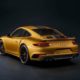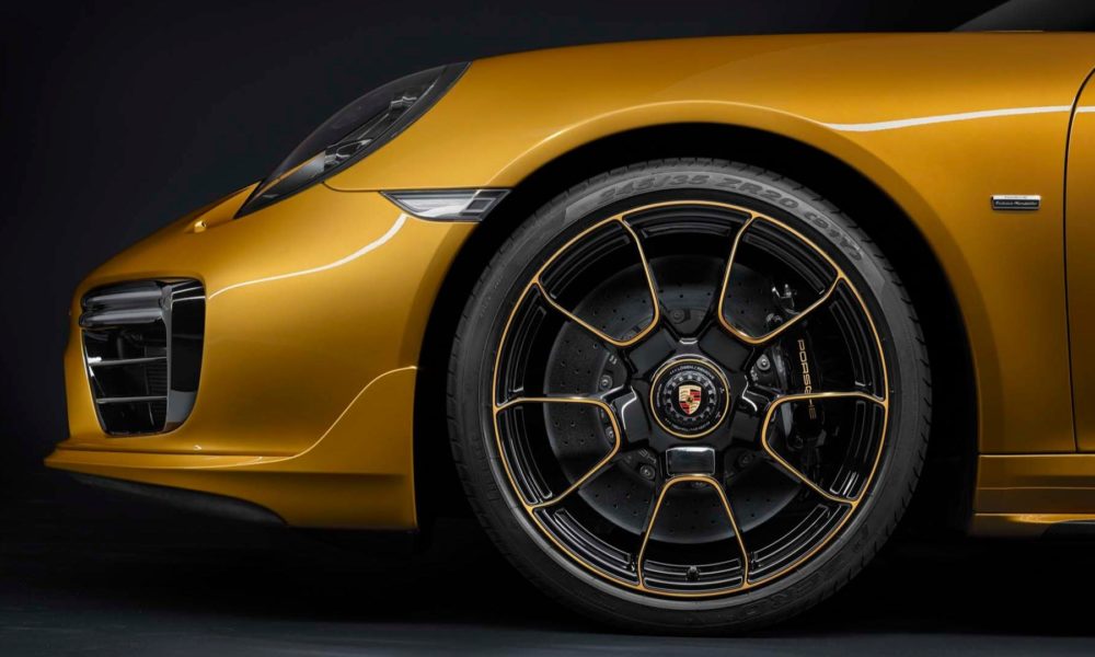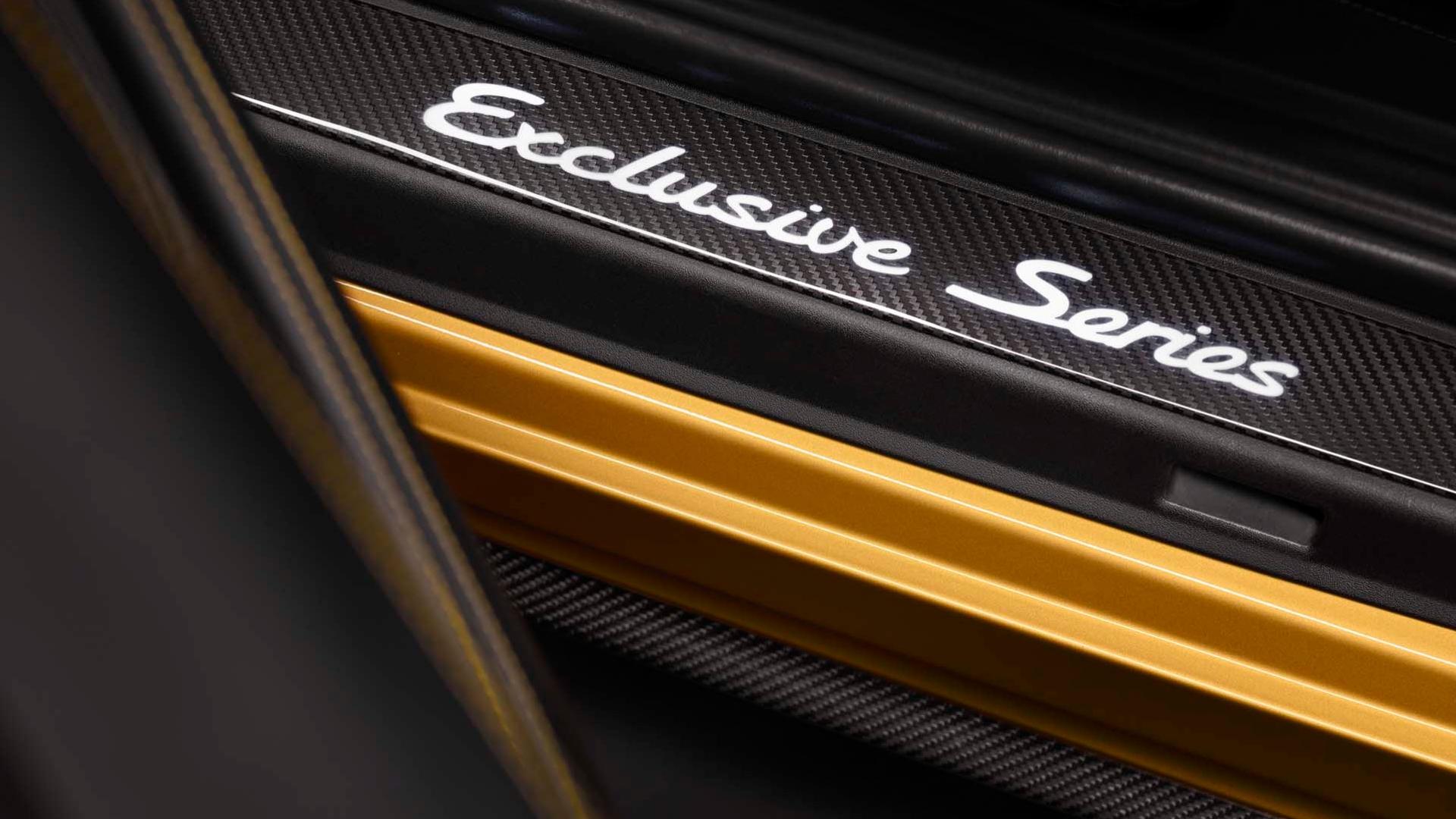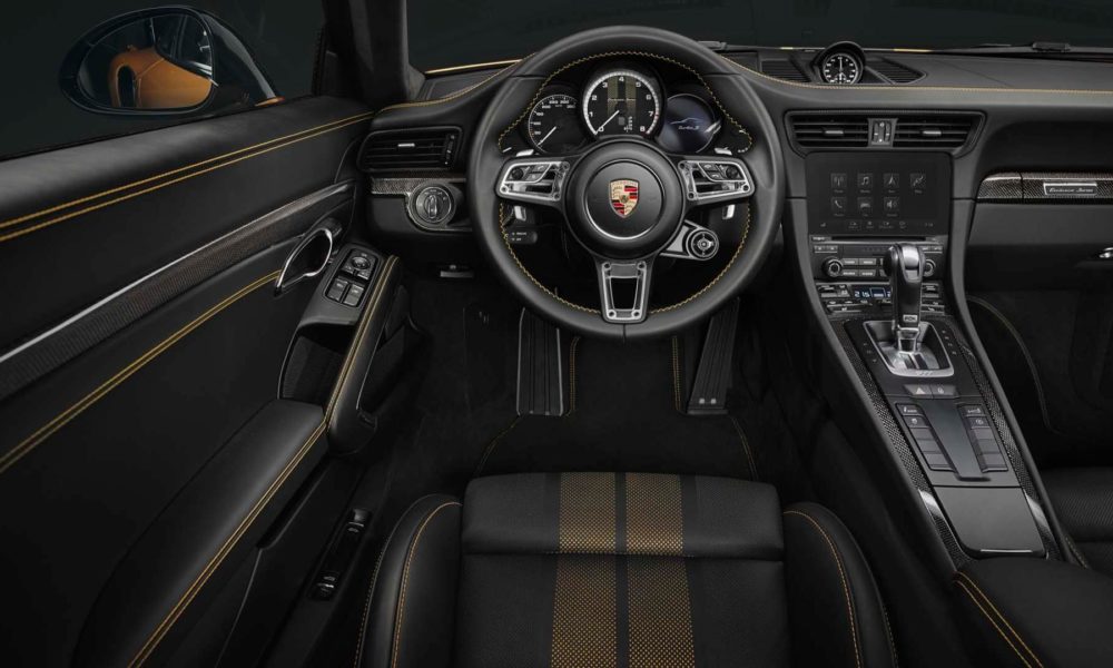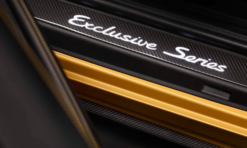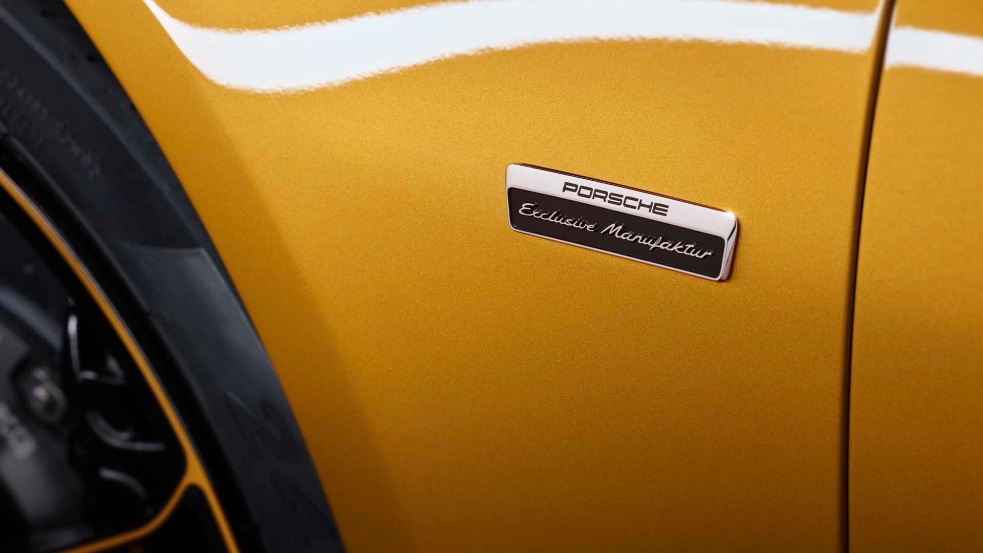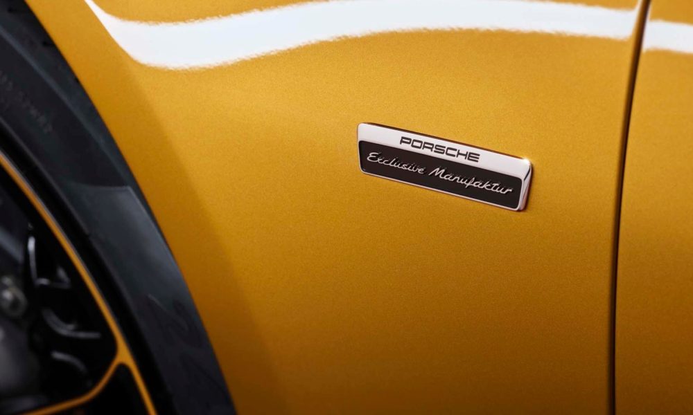 The bodywork gets an exclusive Golden Yellow Metallic paint finish and the various components in carbon, like the bonnet, roof and side skirts. The rear-end is characterised by a wing from the Turbo Aerokit, the new apron, the ram-air scoop in carbon and the exhaust system with two twin tailpipes are made from stainless steel in Black. The wings are decorated with Porsche Exclusive Manufaktur plates. Porsche says, in addition to Golden Yellow Metallic, the vehicle is offered in a range of other “carefully selected” exterior colours.