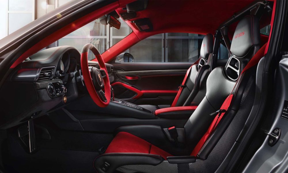 The passenger compartment of the 911 GT2 RS is dominated by red Alcantara, black leather and interior parts with a carbon-weave finish as standard. As with every 911, the Porsche Communication Management (PCM) is the central control unit for audio, navigation and communication. The Connect Plus module and Porsche Track Precision app are also included as standard, enabling detailed recording, display and analysis of driving data on a smartphone.