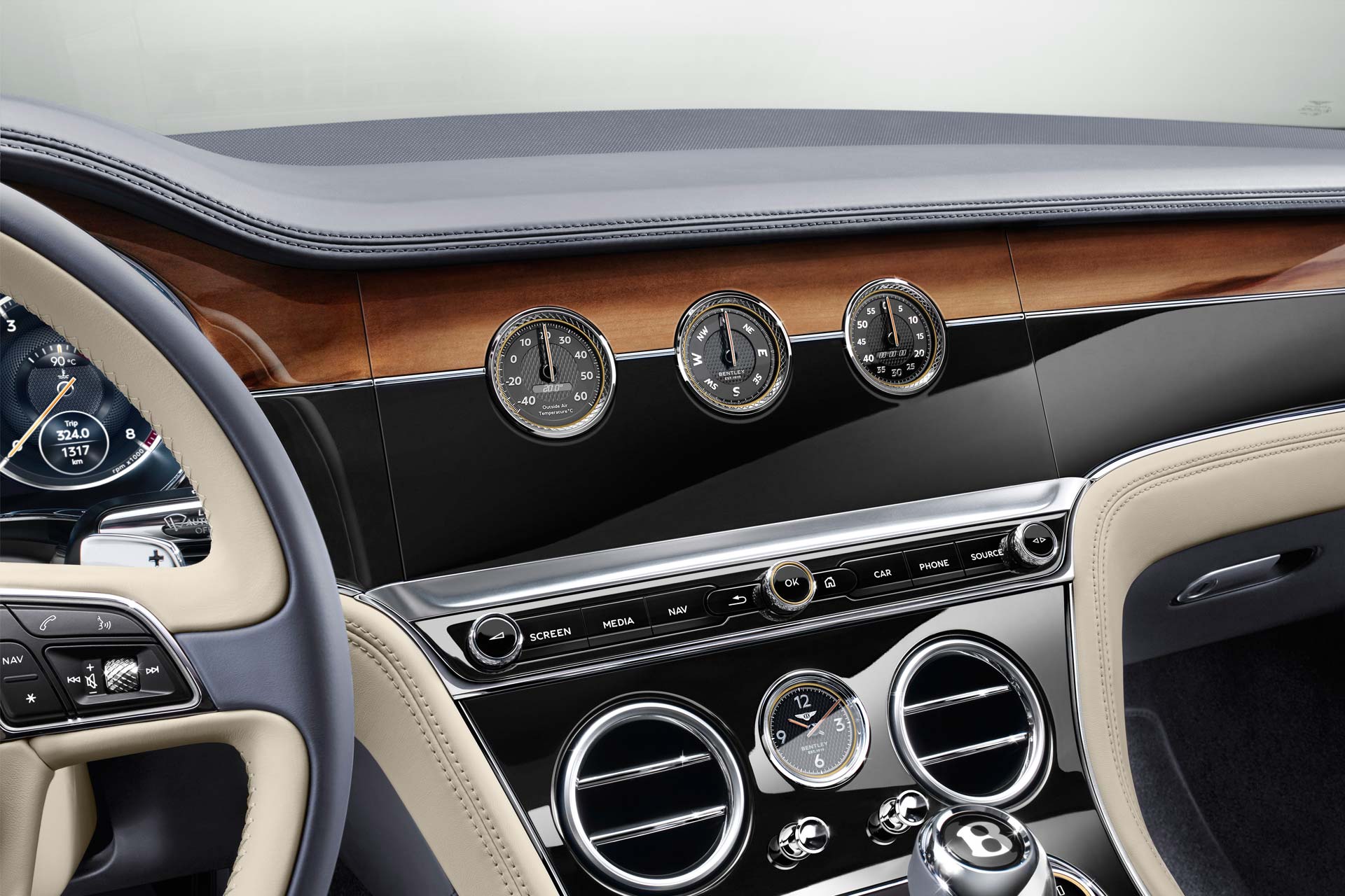 The centre console can be specified in a new technical finish that is inspired by the delicate mechanical surfacing inside the finest automatic Swiss watches, known as Côtes de Genève, said Bentley. This surface, claimed to be first in the automotive world, is machined onto 0.6 mm-thick aluminium and is created by machining from side to side to create a linear pattern. Each row is 5 mm wide and machined at an angle to give a truly three-dimensional finish, with each pass of the machine making a minute step of 0.5 mm.