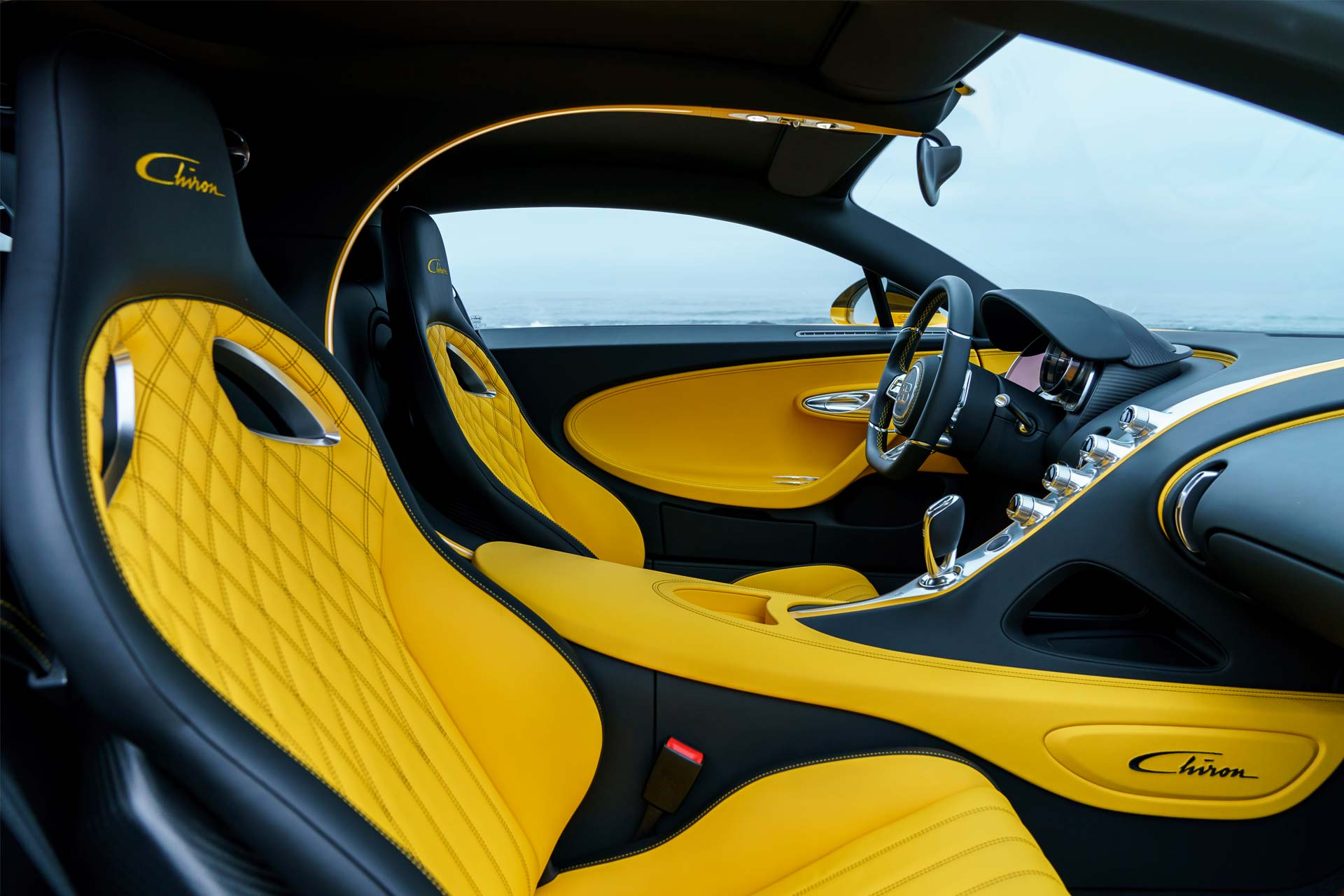 The first US Chiron is a real eyecatcher with its yellow and black colour scheme. The front of the vehicle is finished in bright yellow and the rear in black ‘Nocturne’. The ‘Classique’ wheels, the Bugatti horseshoe emblem and the trim part of the prominent side line are also painted yellow.