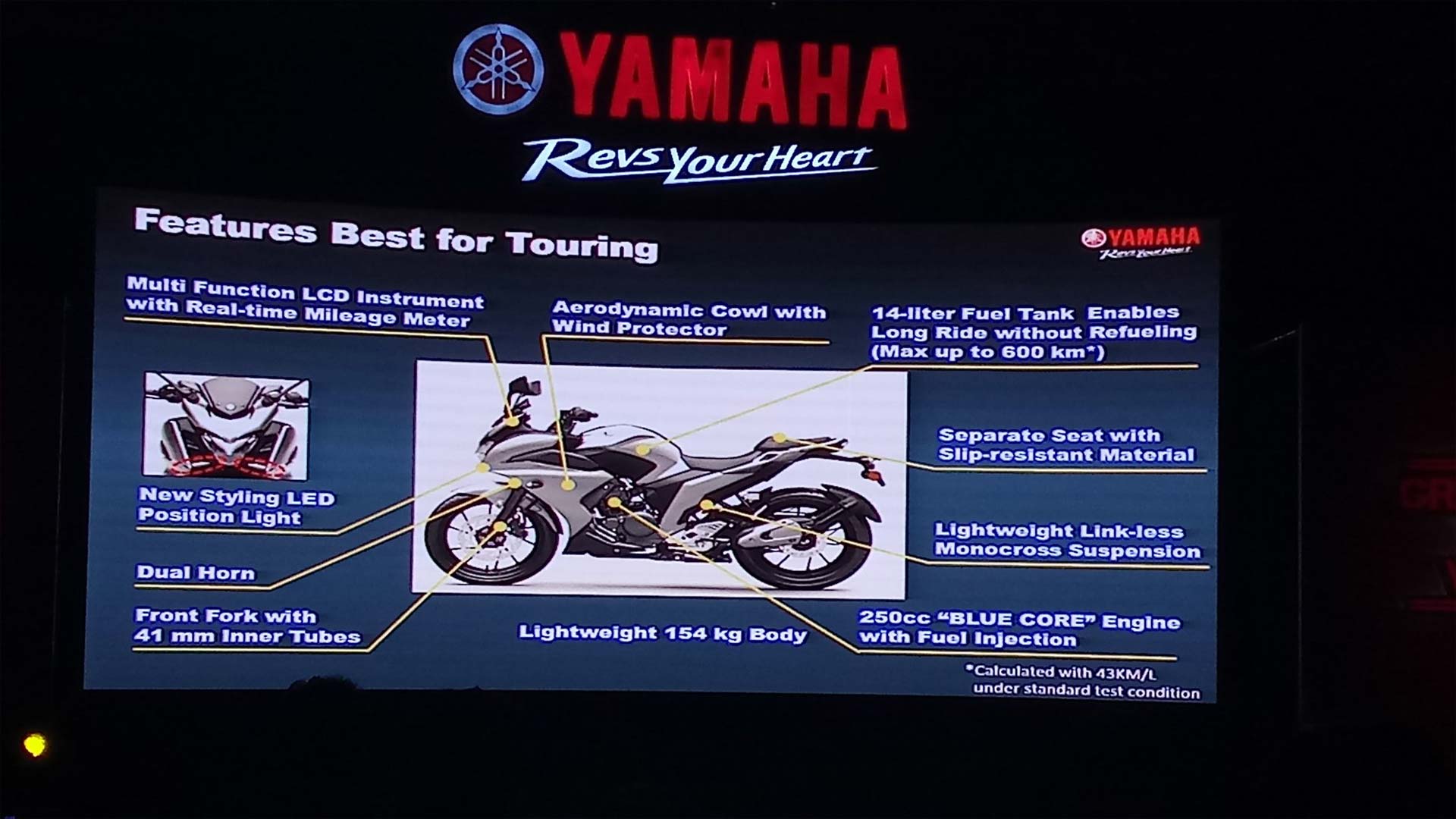The bike weighs 154 kg kerb, 6 kg more than the FZ25. Features include LED headlamp, LED positioning lights, LCD instrument cluster with real-time mileage meter, and dual horn. Fuel tank can hold 14 litres.
