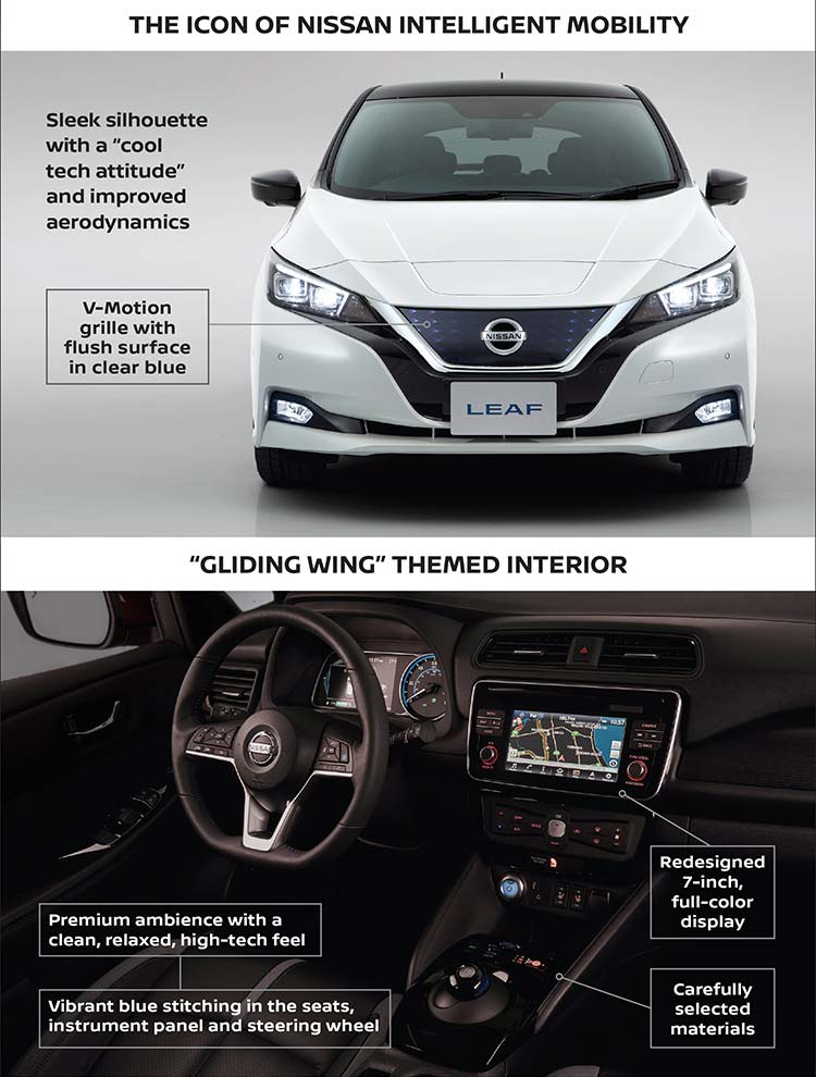 Other exterior features include LED projector headlamps and a signature rear combination lamps. The integrated spoiler gives the new Leaf a sporty look. Overall, the aerodynamic design has resulted in a drag coefficient of 0.28 Cd.