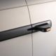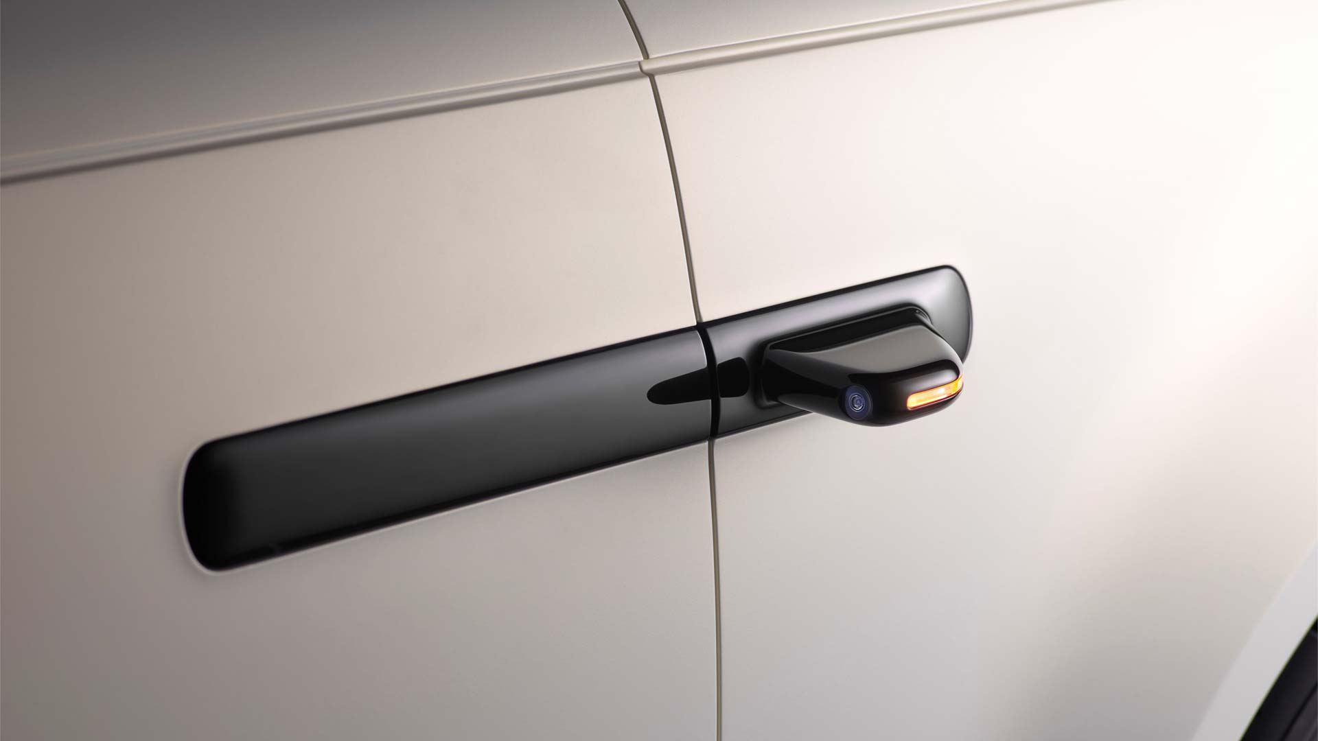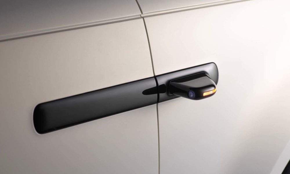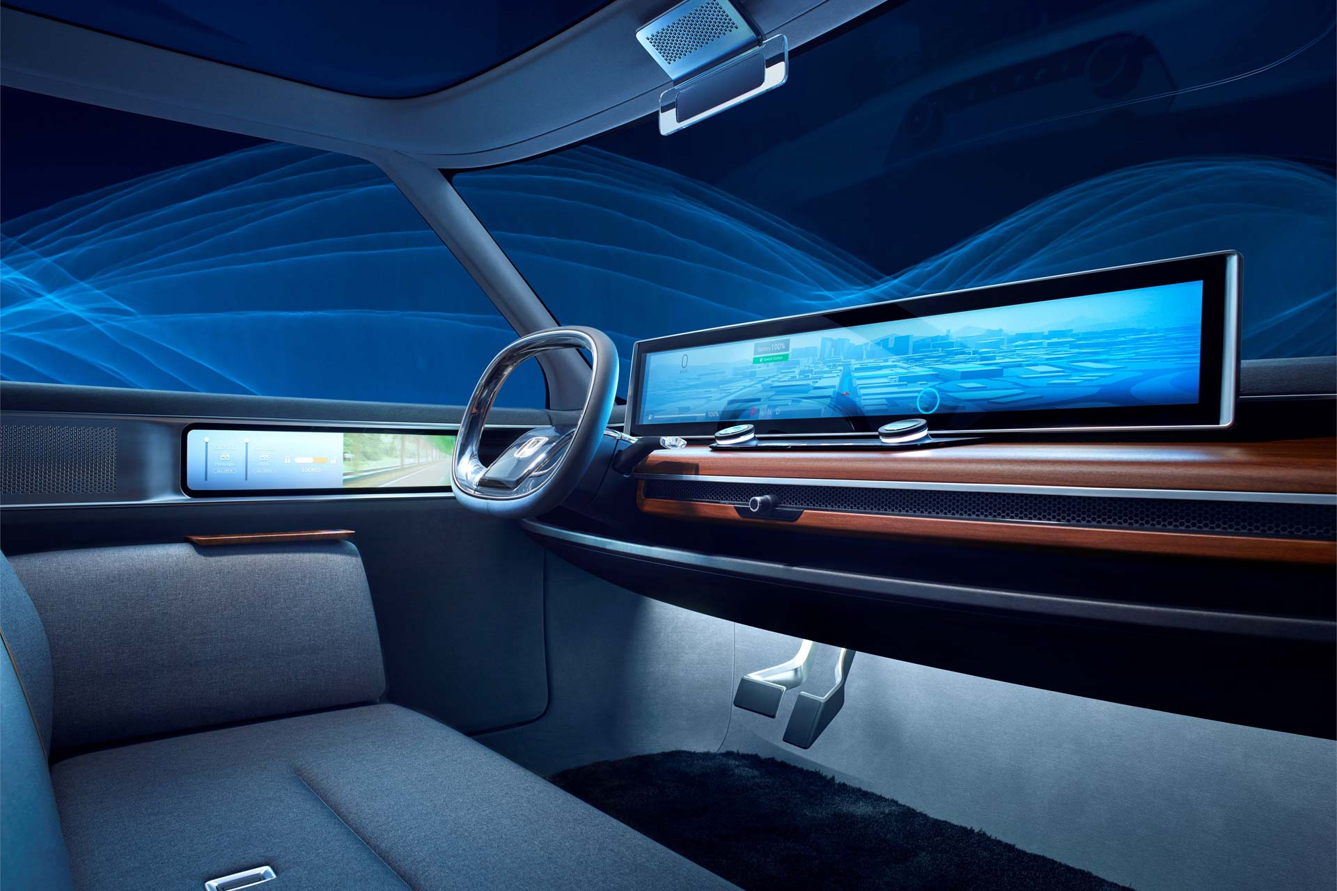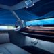 The same wood finish wraps around a large ‘floating’ dashboard console. This houses the steering wheel column, a set of simple control buttons, and a panoramic display screen. The dashboard itself is completed by a wrap-around screen that runs behind the console and extends into the doors. The main dashboard screen presents a range of vehicle information including the remaining battery level. Whilst the extended door displays function as the car’s wing mirrors, fed by the exterior cameras.