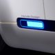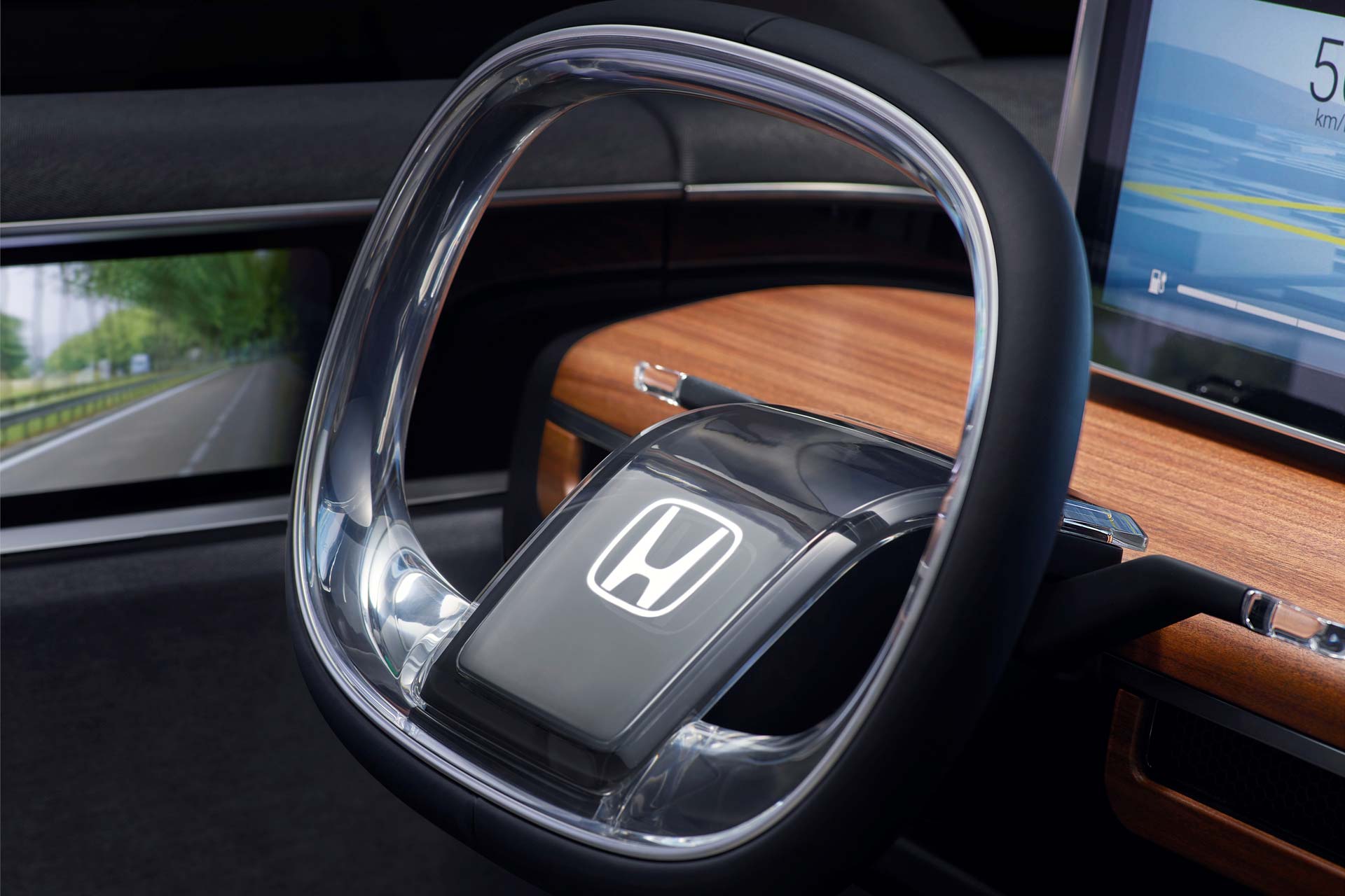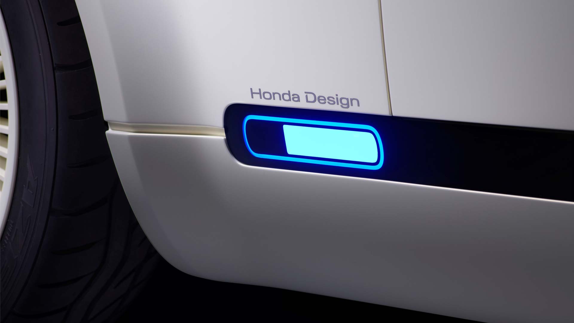 The car’s low and wide proportions give it a planted, muscular stance hinting a sporty driving performance. The EV’s length measures 100 mm shorter than the Jazz supermini. The Honda emblem on the concept is backlit in blue, which previews a new styling feature for the company‘s future EVs. At the front of the car, interactive multilingual messages can be displayed between the headlights, including greetings, advice for other road users, or charging status updates.