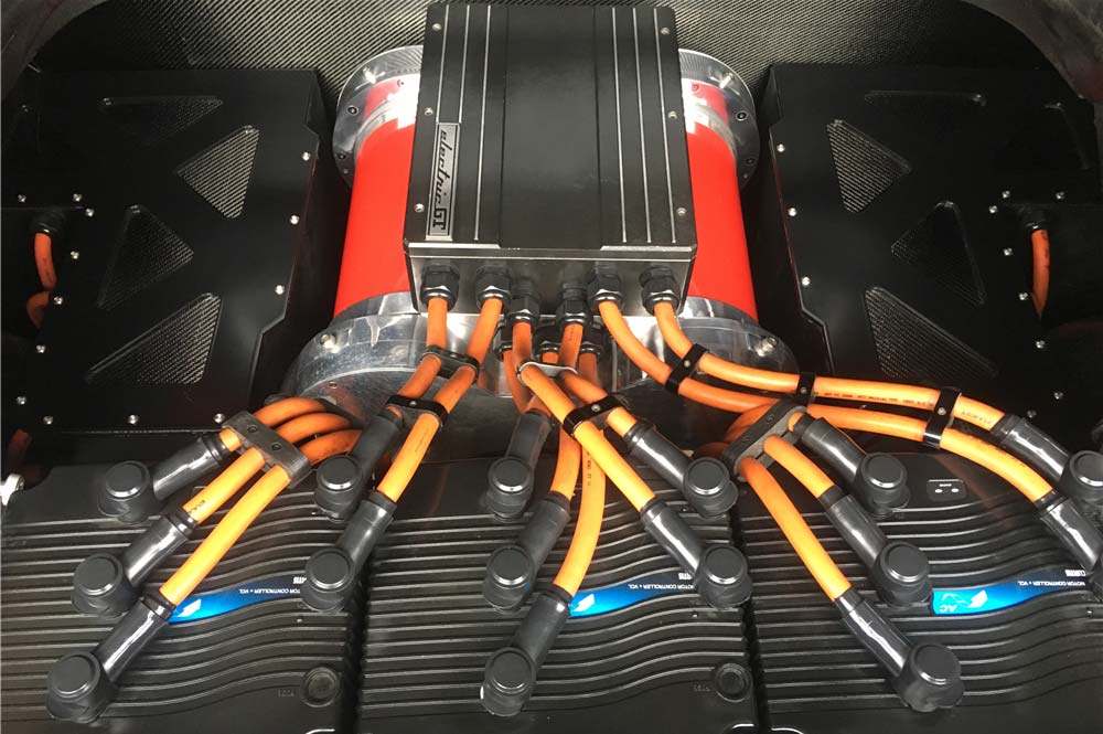 Replacing the 2.9L V8 are three HPEVS AC-51 electric motors, each producing about 88 hp and 146 Nm (108 ft-lbs) of torque, paired with a 5-speed manual gearbox (G50 Porsche transaxle). There’s a 47 kWh battery pack contained in custom aluminium and carbon fibre boxes. The seller claims a top speed of 185 mph (298 km/h).