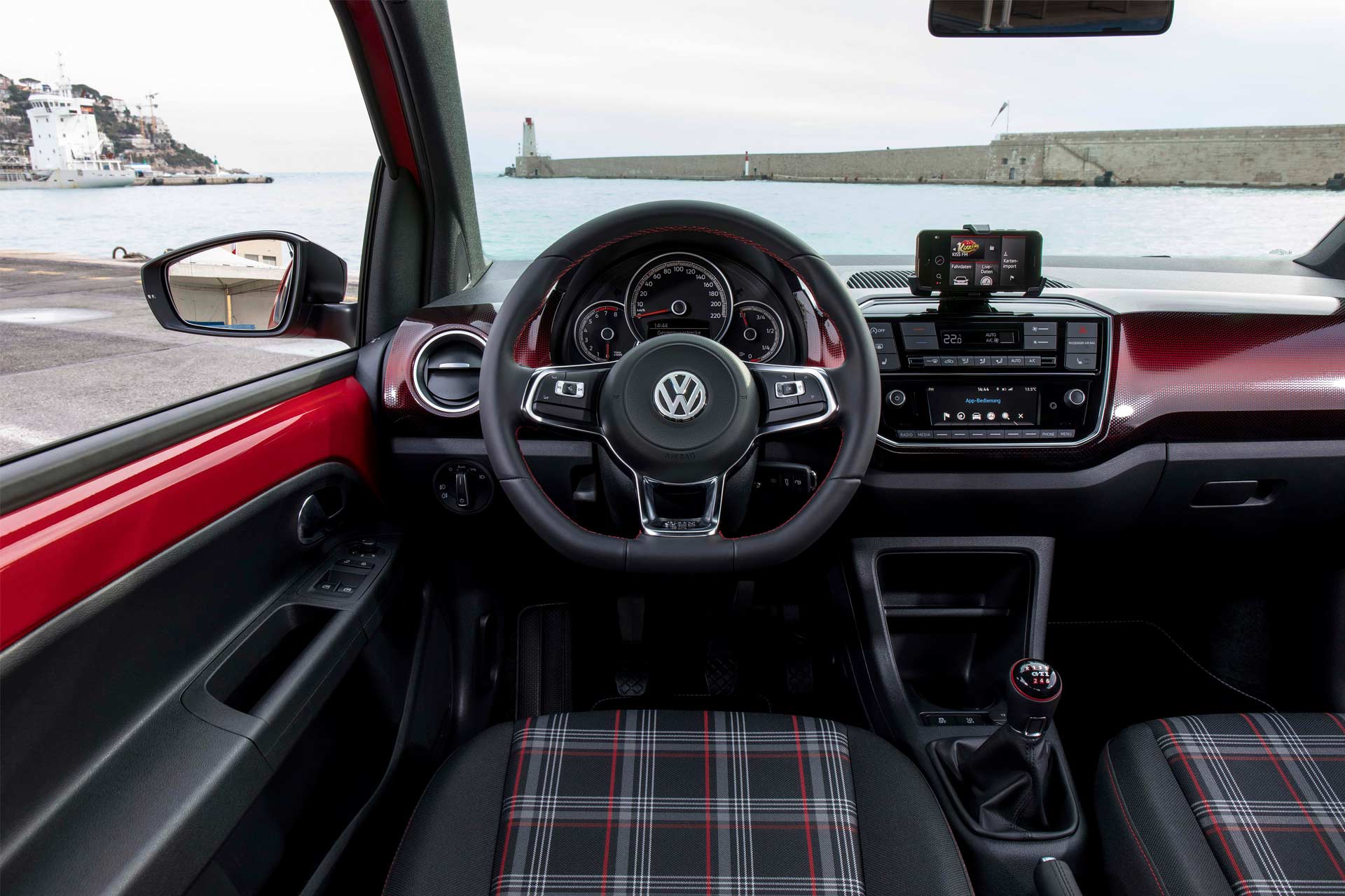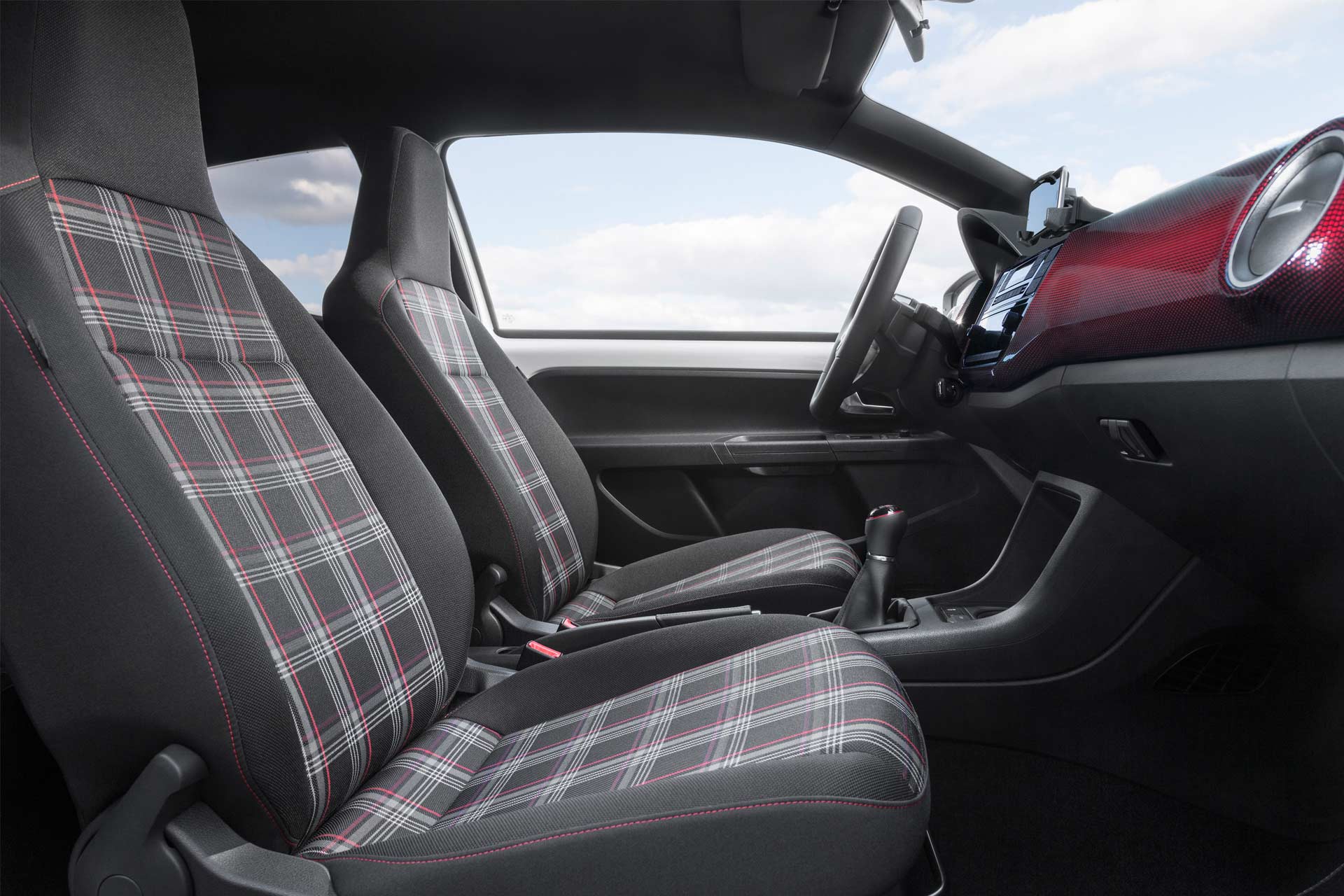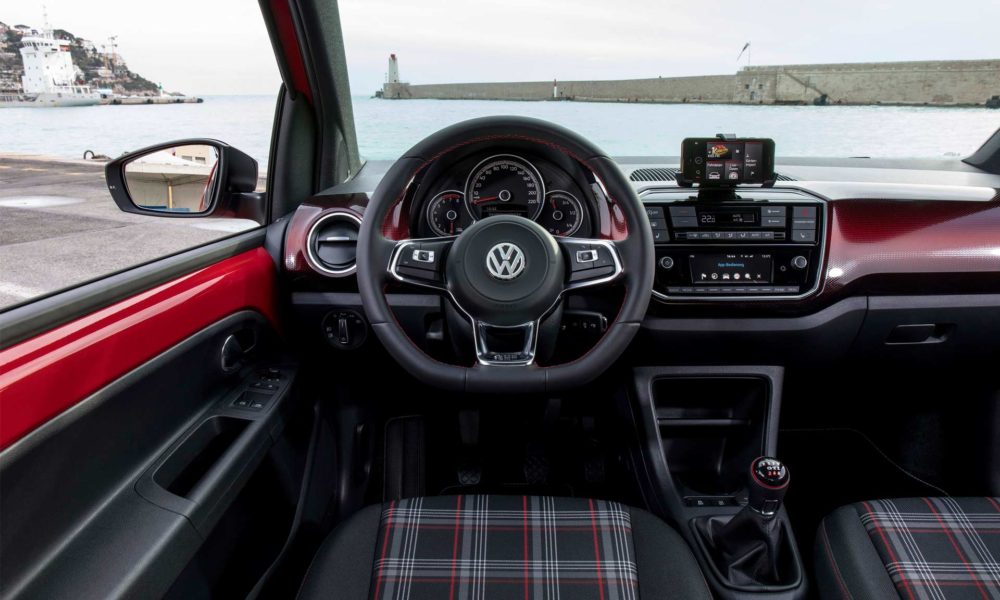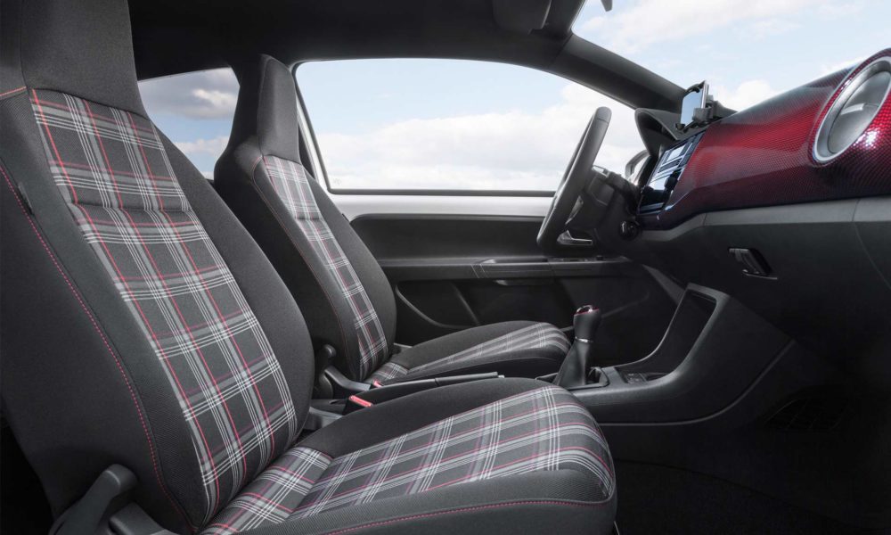 The 2018 car retains the golf ball-style-knob of the 1976 GTI. Like the original model, the up! GTI’s seats also feature the famous “Clark” tartan check upholstery. Don’t miss that flat-bottom leather-wrapped sport steering wheel.