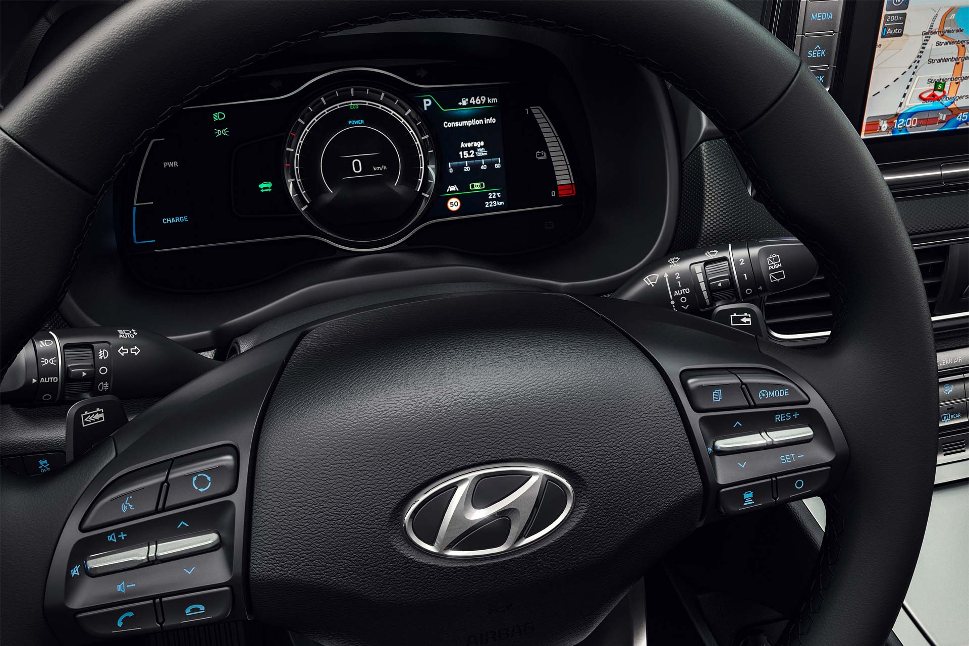 The Kona Electric is offered in two powertrain options. The short-range version packs a 99 kW (135 hp) motor that has a maximum torque of 395 Nm (291 lb-ft). The battery pack is a 39.2 kWh lithium-ion polymer, that is good for a range of 300 km/186 mi (internal target under WLTP regulations). Charging times with Standard (AC) is claimed to be 6 hrs and 10 minutes, with Quick Charge (DC) it takes approx. 54 min to get up to 80%. Hyundai claims an efficiency figure of 14.8 kWh/100 km.