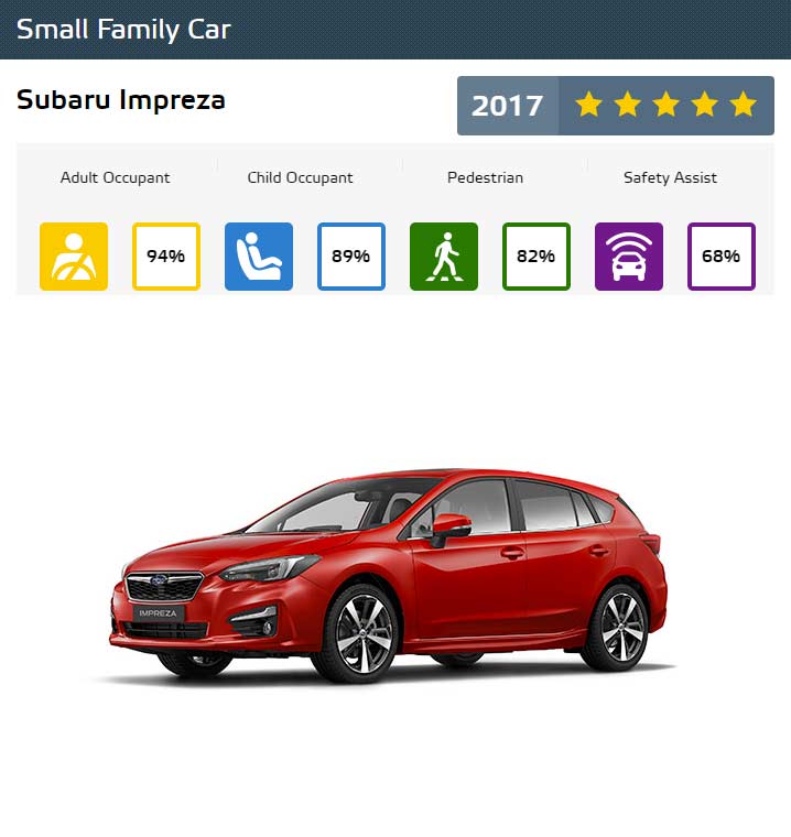 Another Subaru in the list is the lowered suspension/regular version of the XV, the Impreza. The Impreza managed to impress in the same Small Family Car class scoring 94% for Adult Occupant protection.