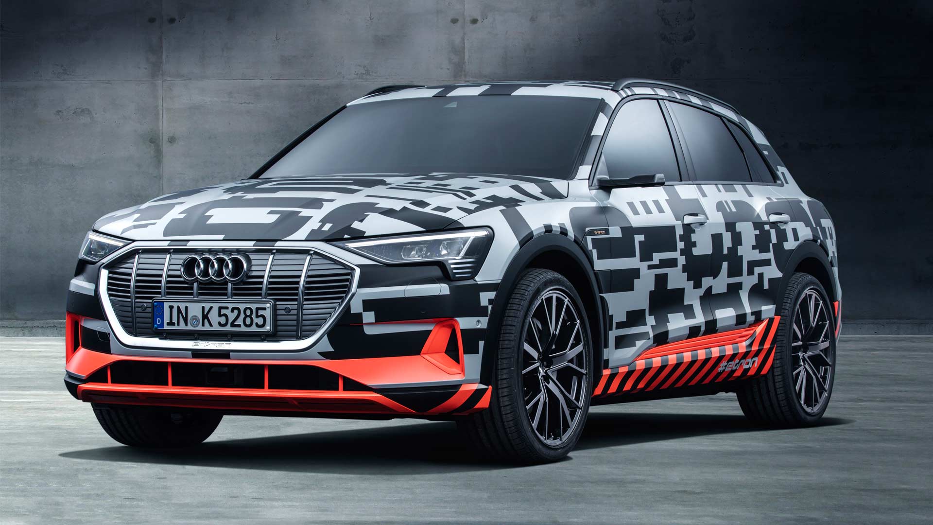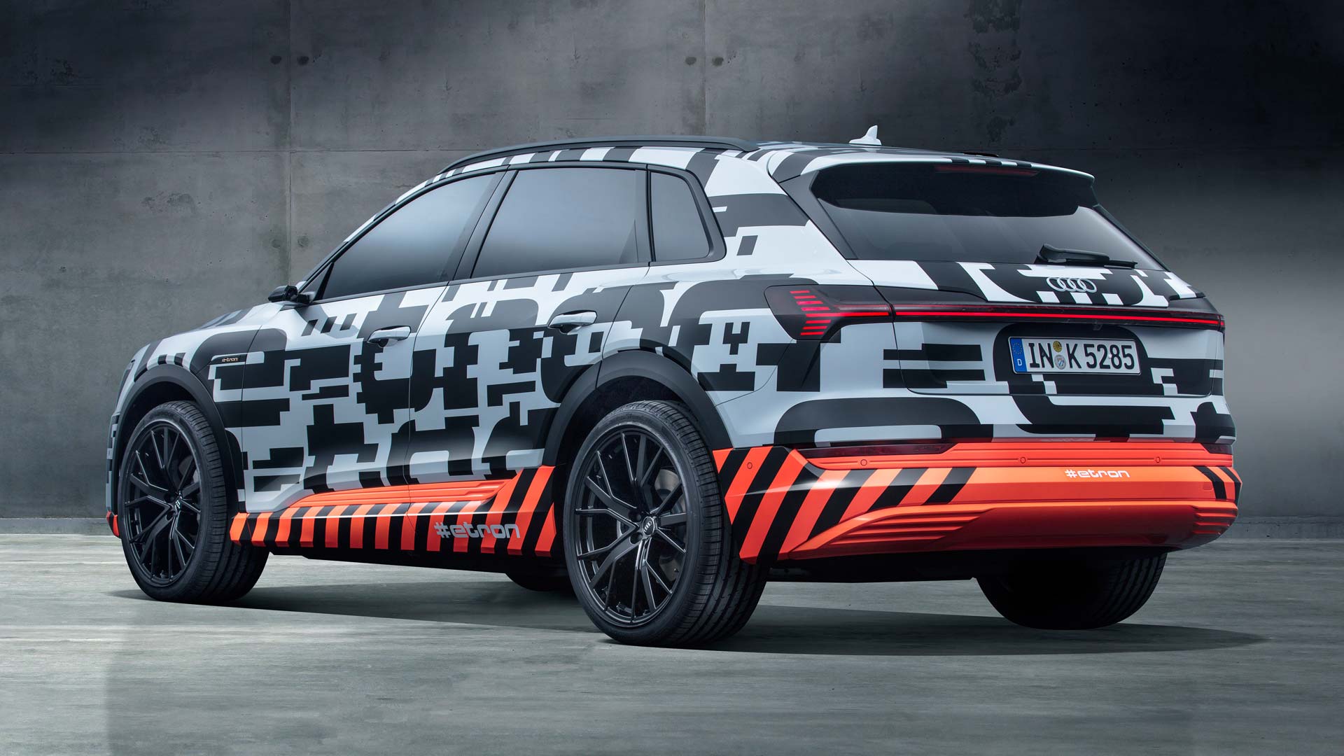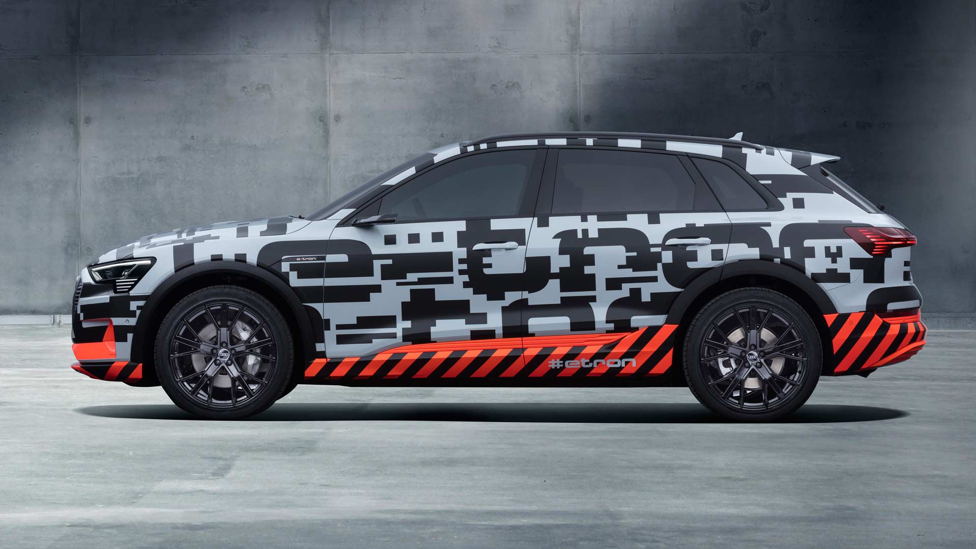 The Audi e-tron prototype does not wear a traditional camouflage, but instead illustrates its electrification with a specially designed film. The distorted e-tron lettering stretches across the entire flank, as if it was charged with electricity. Mimicking the high-voltage grid, the orange elements is to suggest that the e-tron prototype is fully electric – the lower part of the car has alternating orange and black segments to indicate where the battery or the energy center of the car is located.