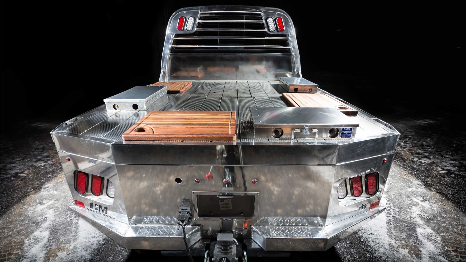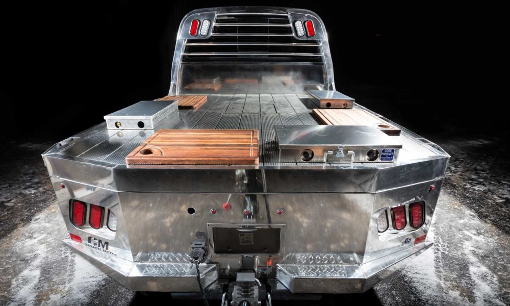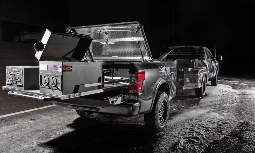 The heart of Smokin’ Titan lies inside the custom trailer behind the truck. Since food smoking can create heat up to 600-degrees, the Titan XD’s factory bed was removed from the truck and put on a B&S Custom trailer to prevent that heat from affecting the truck. The bed-trailer features two Titan Boxes as lockable dry storage for the smoker pellets and wood chips flanking the smoker. Utilizing the Titan’s Utili-Track System, a B&S Customizing sliding tray was designed to easily slide the smoker in and out of the bed, supporting the custom Lang BBQ Smoker and Char Grill.