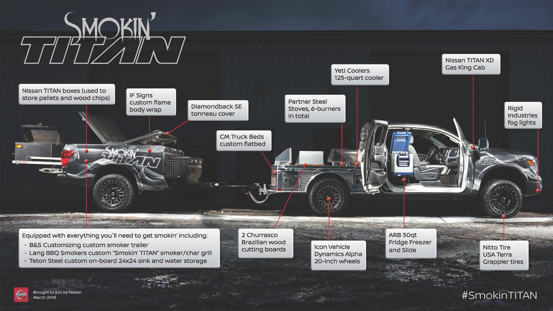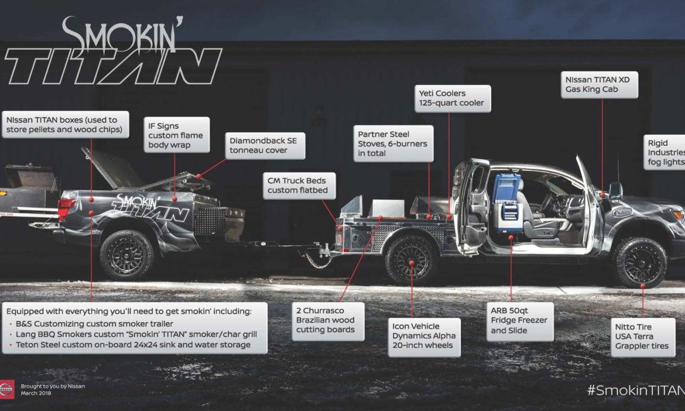 “Beginning as a Titan XD King Cab straight from the Nissan Canton, Miss. Assembly Plant – where every Titan and Titan XD is assembled – Smokin’ Titan is a dream project vehicle for tailgating and barbecuing enthusiasts like myself, and I can’t think of a better way to showcase it than at – and along the way to – The Great Titan Meat Up,” said Billy Hayes, division vice president, Nissan Regional Operations, and a brainchild behind the vehicle. “I am very excited to get out there and show the world what this truck can do!”