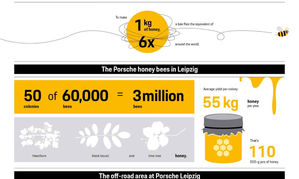 In the Leipzig factory’s off-road area, Porsche has set up 50 bee colonies which are now home to around 3 million bees. The honey is even available in the Porsche Leipzig customer centre shop under the brand ‘Turbienchen’.