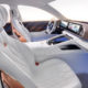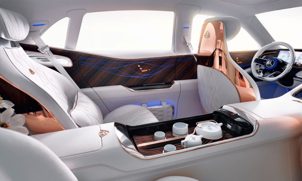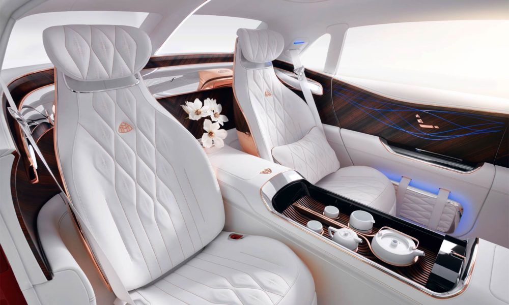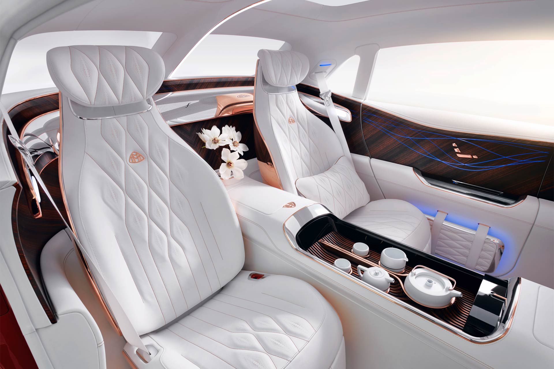 The wide centre console extends all the way to the rear, and is equipped with an integral, heated tray with teapot and cups. Speaking of which, the tea service is integrated into a sculpted wooden tray made of ebony, known as “Magic Wood” in traditional Chinese furniture design. At the press of a button, the service can be electrically retracted into the console under a sliding cover finished in high-gloss black.