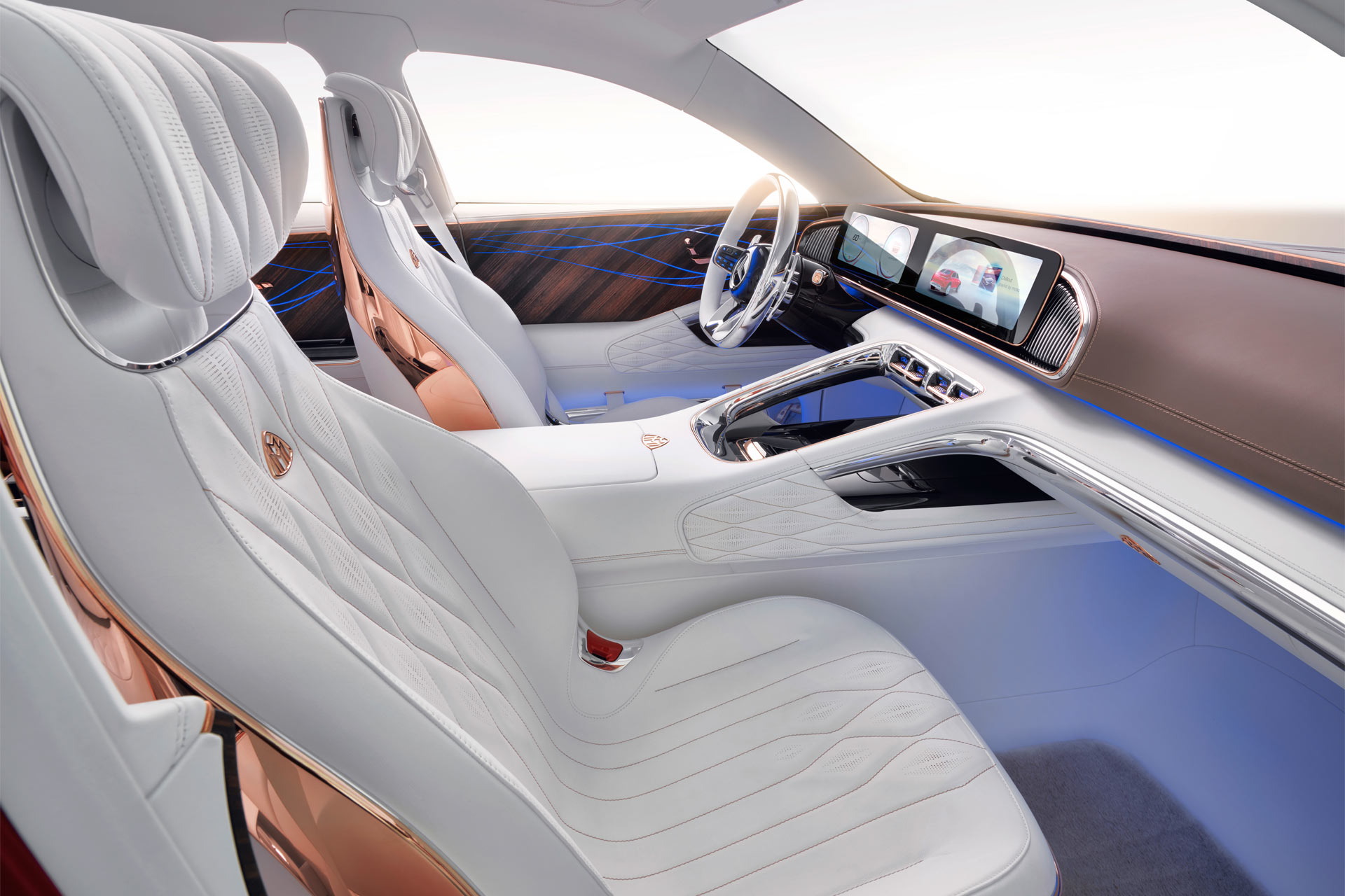 The cabin has a feeling of luxurious lightness and spaciousness, thanks to the usage of materials. The crystal white Nappa leather upholstered seats feature fine perforations in rose gold. The familiar two 12.3‑inch displays are present here too.