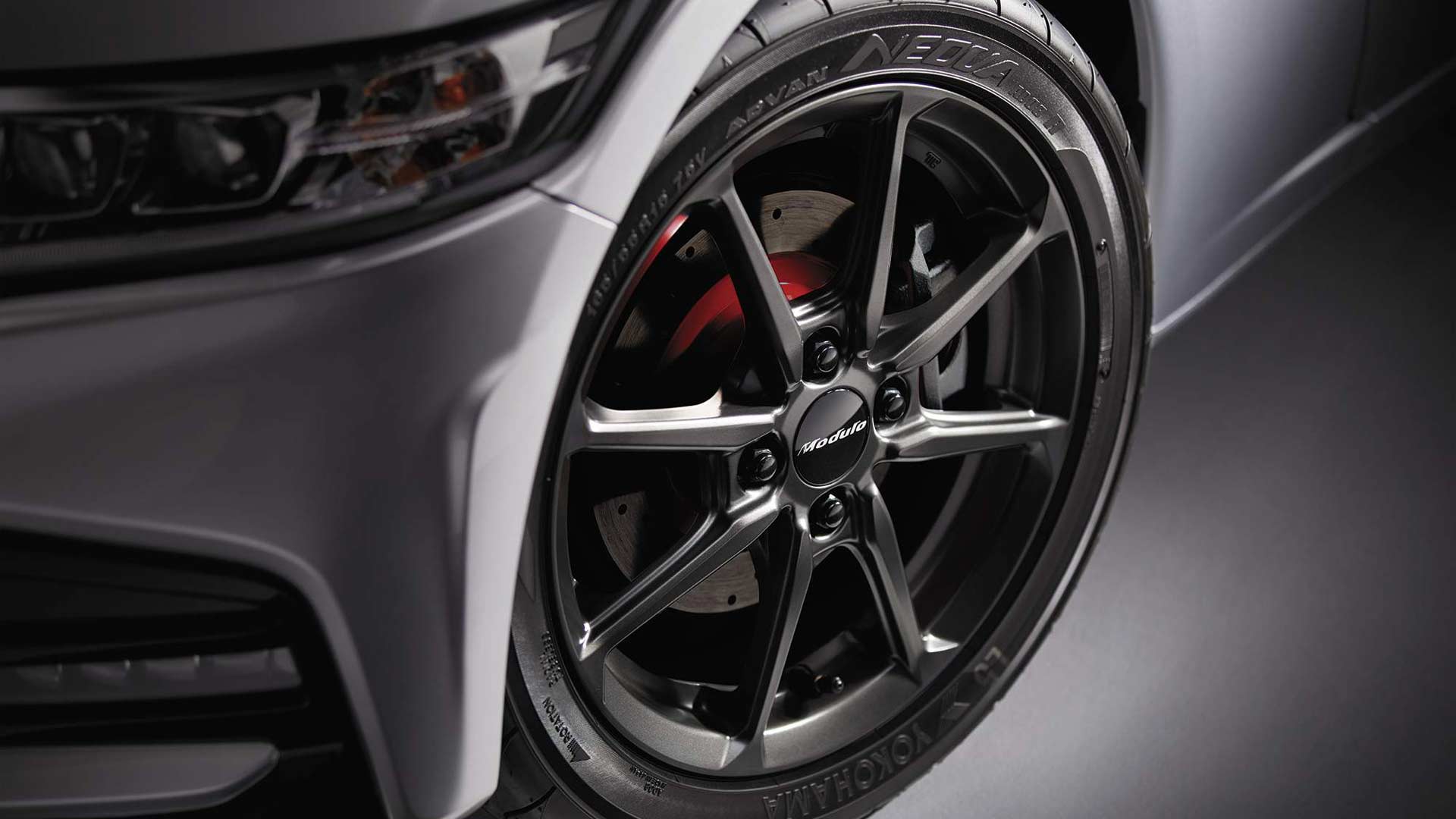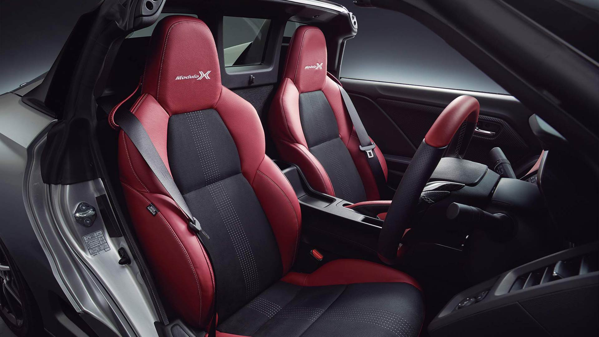 The black interiors get genuine leather-upholstered sports seats, genuine leather-wrapped steering wheel, Modulo X instrument cluster, titanium shift knob, Bordeaux Red carpet mats, and some generous Bordeaux Red accents. The door pads get carbon fibre-like appliques as well.