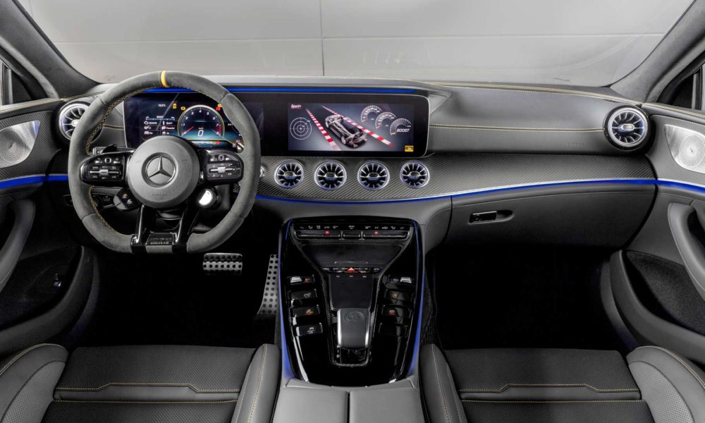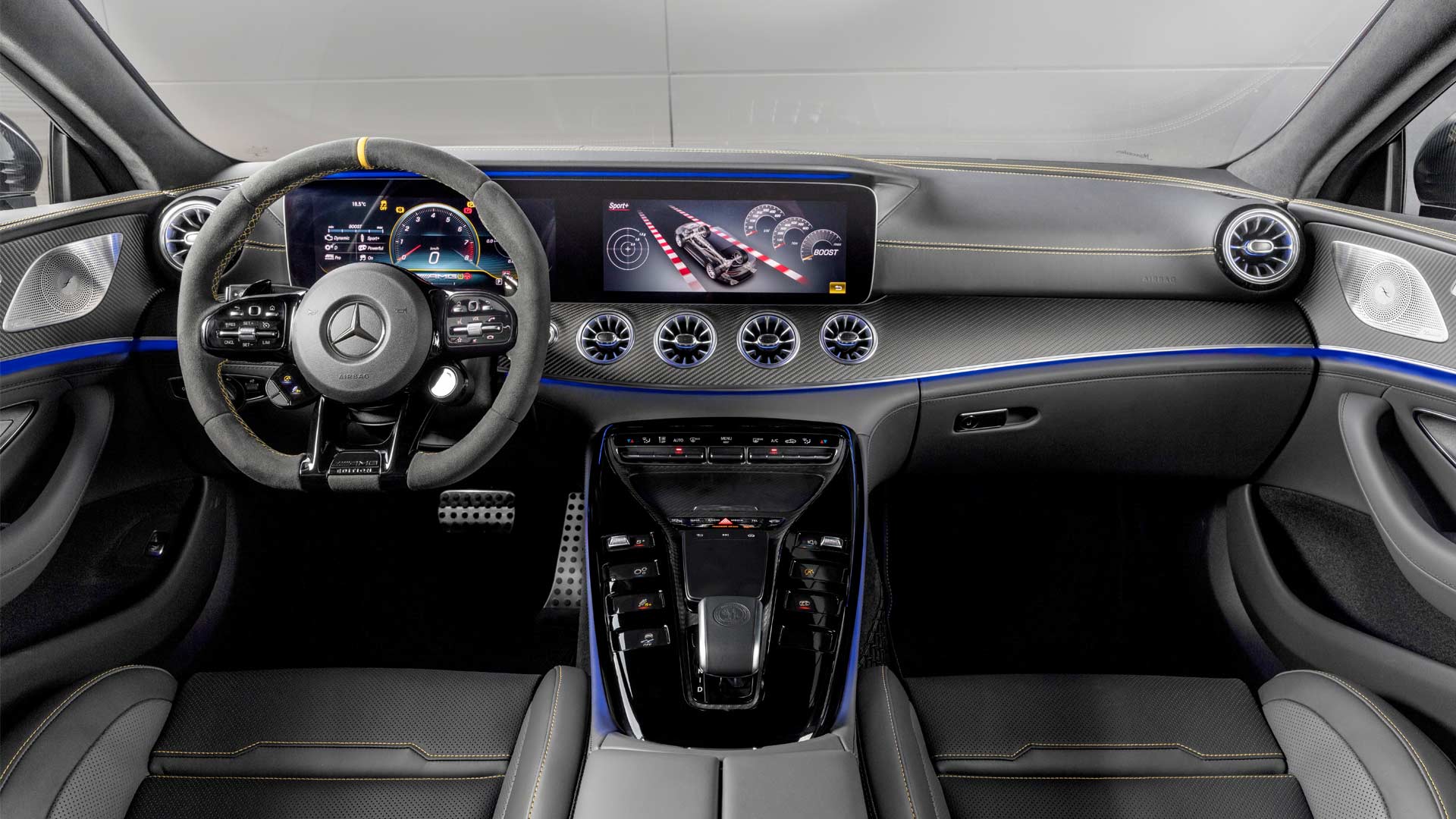 Available on the top-of-the-range GT 63 S 4Matic+, the Edition 1 gets AMG Aerodynamics Package including a larger front splitter and enhanced rear diffuser. Compared to the standard vehicle with its adjustable spoiler extended to the max, at 300 km/h an additional 30 kg of downforce presses the rear axle down. The larger front splitter further reduces the front axle lift if the adjustable louvers (Airpanel) are closed.