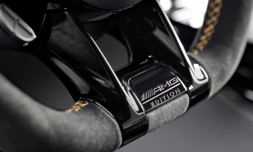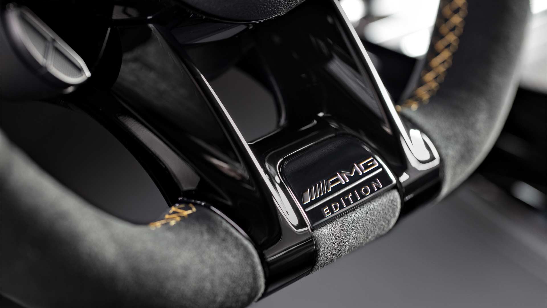 Interiors get AMG Performance seats with memory package, upholstery in exclusive grey/black Nappa leather with yellow contrast stitching, AMG Performance steering wheel with Edition 1 badge, shift paddles in black, matte carbon-fibre accents, seat belts in yellow, Air-Balance Package with “AMG #63” fragrance and few more.