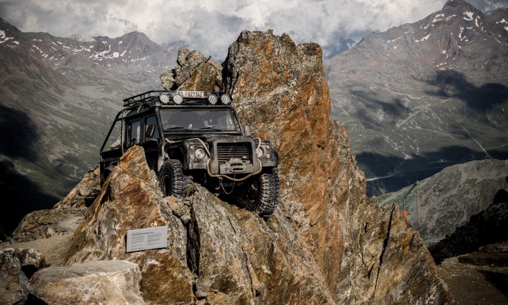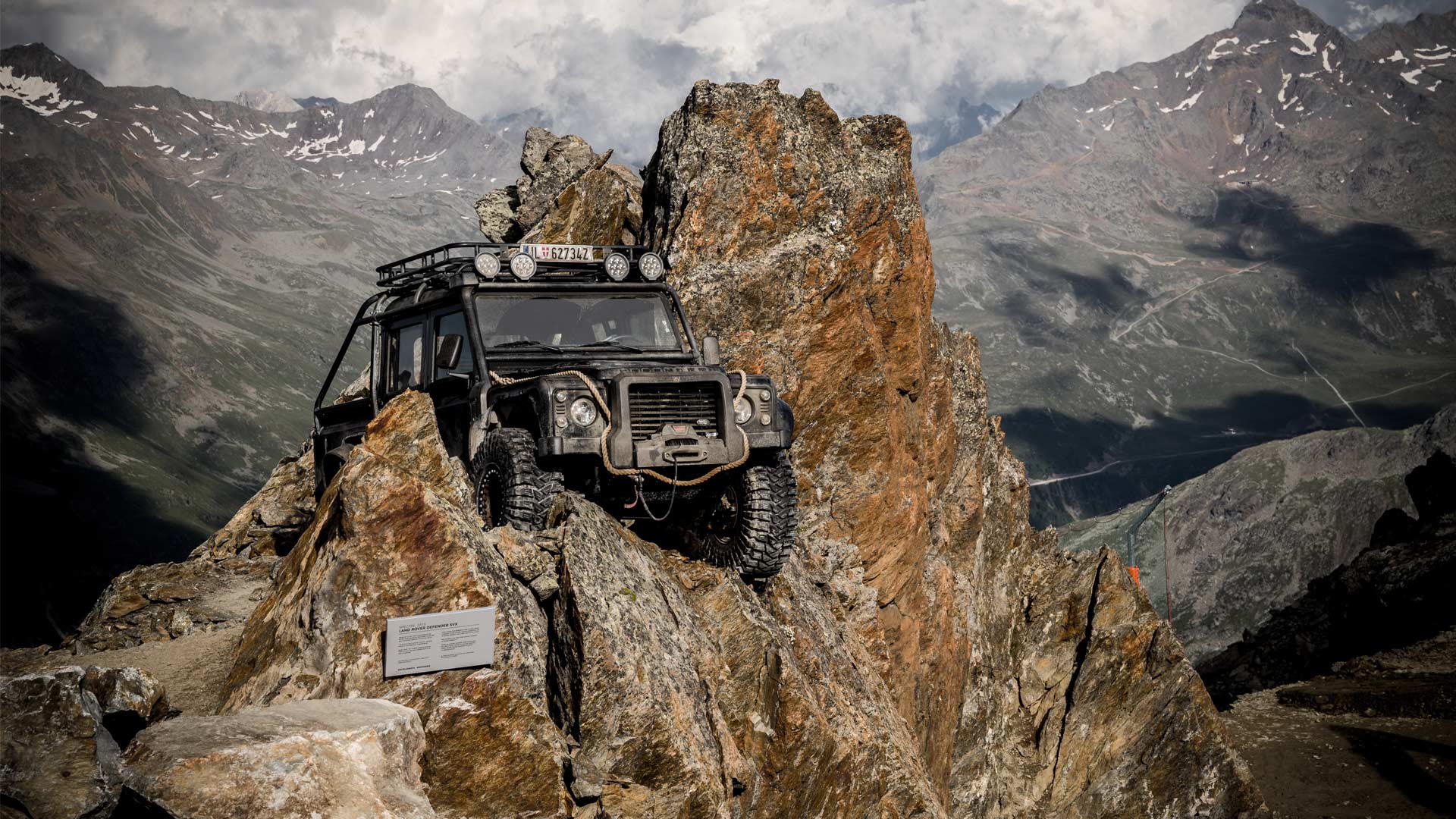 The iconic Land Rover Defender driven by villain Hinx’s henchmen is placed on the cliff edge and the Range Rover Sport SVR driven by Hinx himself (Dave Bautista) is also on display.