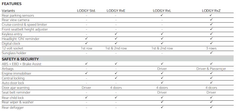 Strangely, the Lodgy brochure mentions that the standard variant comes with ABS + EBD + Brake Assist.