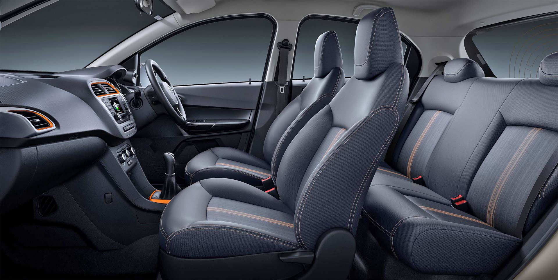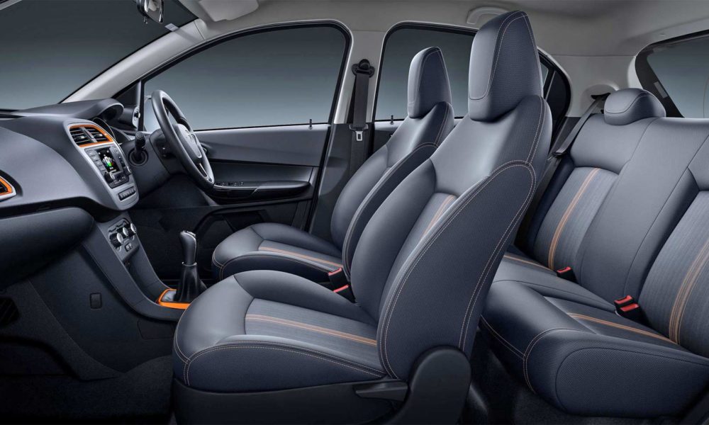 Interiors get black treatment with Canyon orange highlights, seats with body-hugging bolsters featuring a denim-inspired fabric, cooled glove box, 5-inch touchscreen infotainment system by Harman, Navigation with 3D maps, 8 speakers (4 speakers and 4 tweeters), and voice command for media, radio and phone.