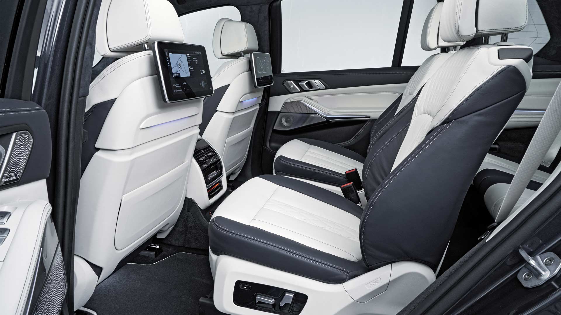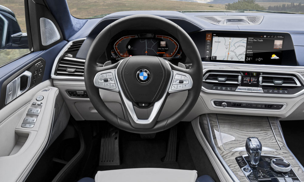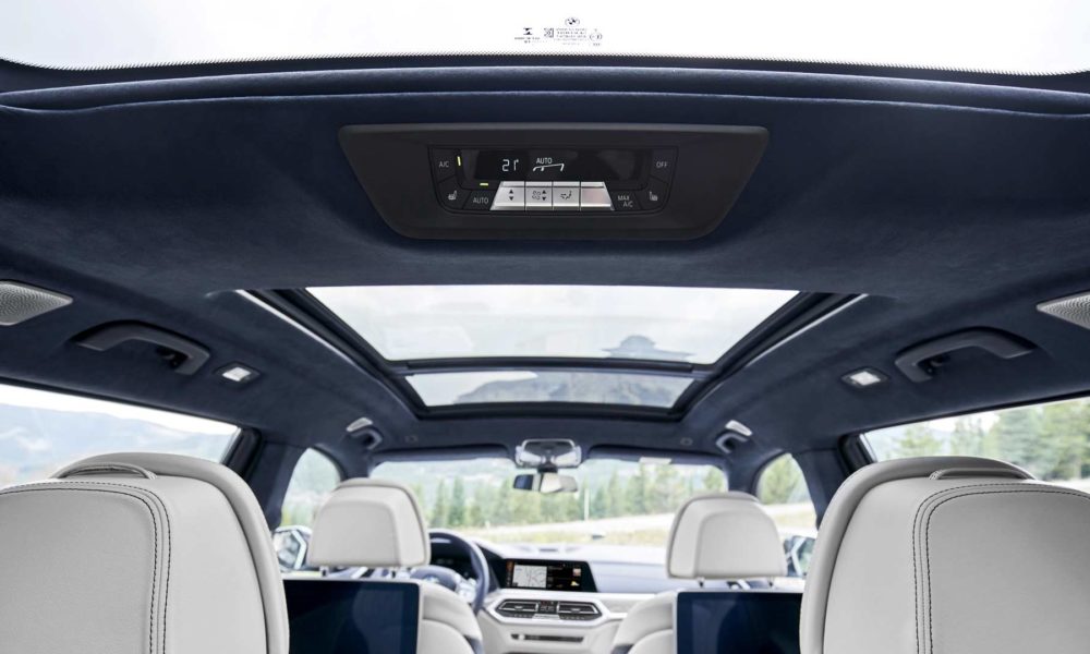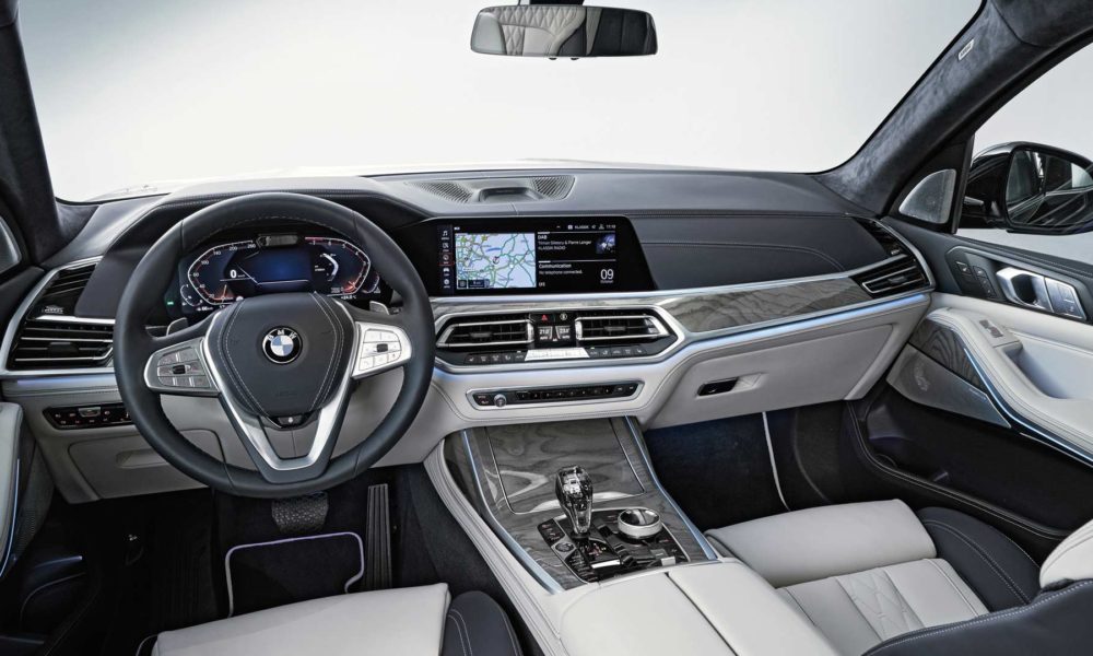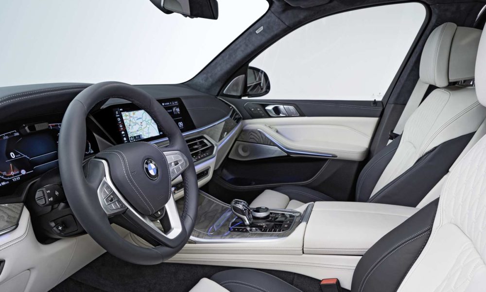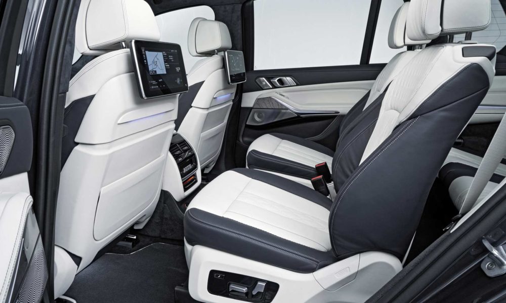 Options list includes five-zone climate control with separate control panel and additional air vents for the third row, Ambient Air package, 16-speaker Harman Kardon or 20-speaker Bowers & Wilkins Diamond surround sound system, Rear-Seat Entertainment Professional system with a pair of 10.2-inch full-HD touchscreen displays, and M Sport package with bespoke interior elements.