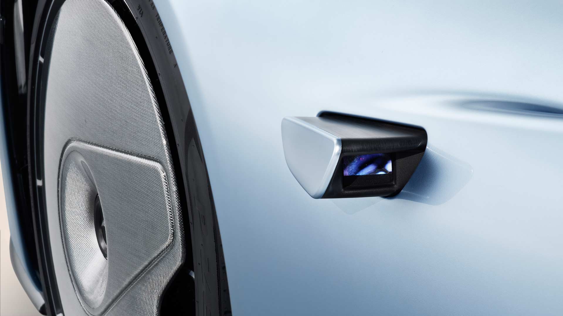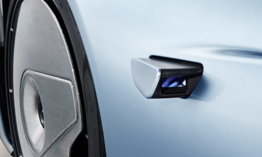 Conventional mirrors have been replaced by these high definition cameras which retract in ‘Velocity’ mode to further reduce the drag. Also notice the carbon fibre front wheel static aero covers to reduce air turbulence around the wheel arches.