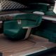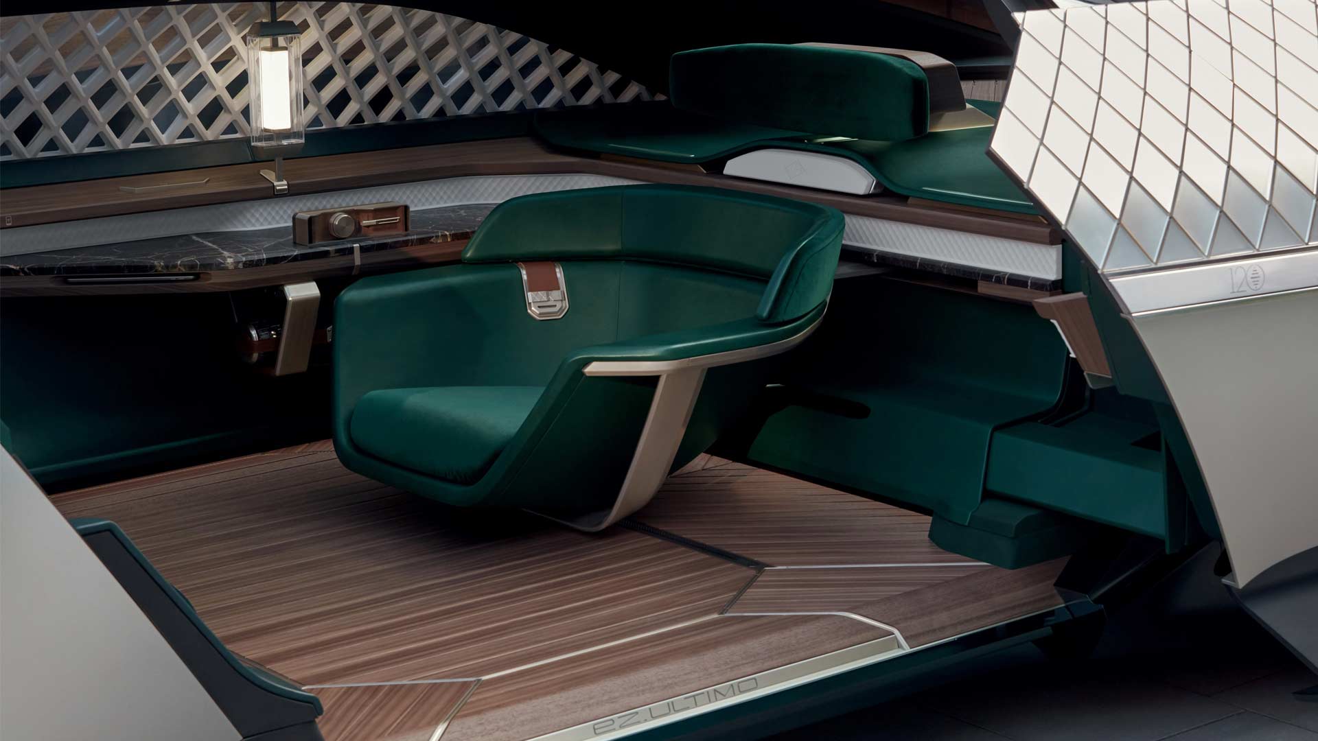Interior access is easy thanks to a wide automatic opening and a seat on a swiveling slide. The vehicle has slightly transparent facets on the upper part of the bodywork for privacy. The relaxed interior layout has materials made of wood, marble and leather.