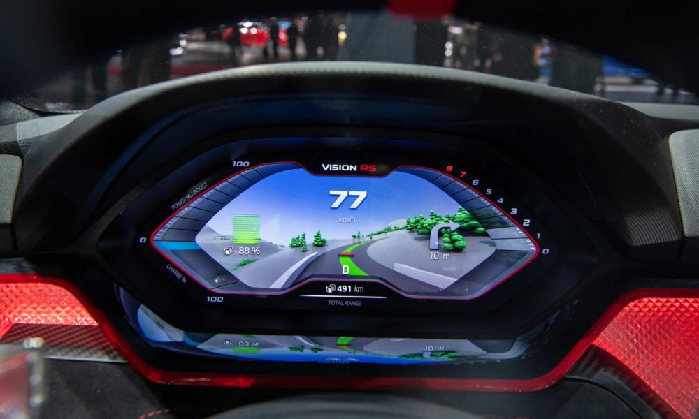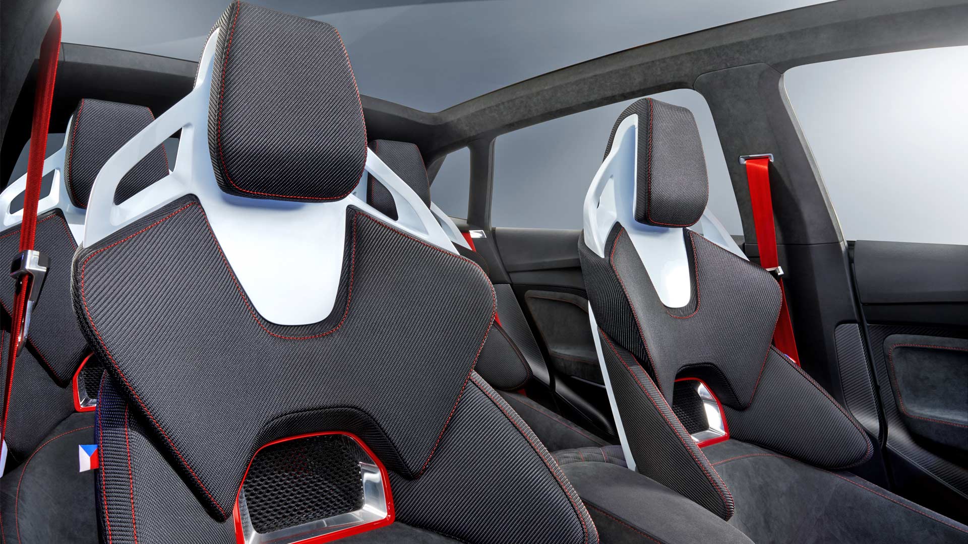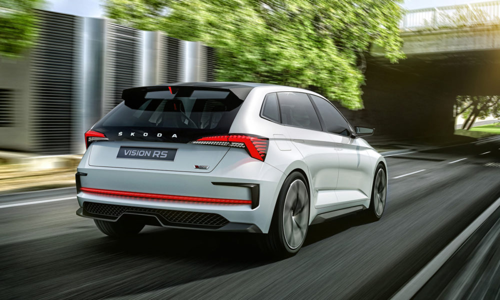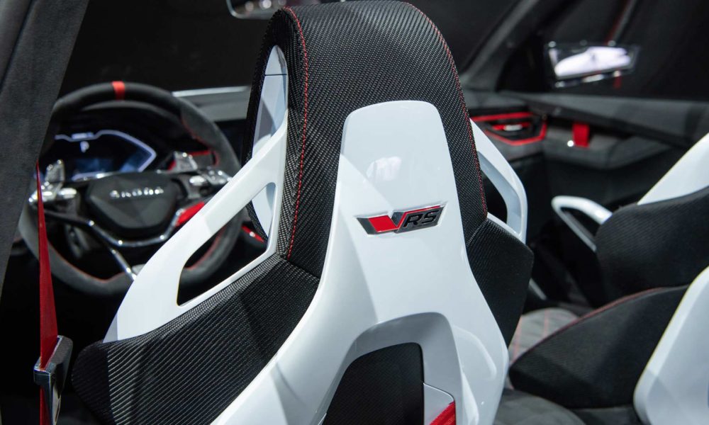 As we saw in the previous post, the Vision RS is a homage to the brand’s Motorsport history and to the cars such as the 130 RS rally car of the ’90s. Design highlights include headlights with four glass zones, sculpted bonnet with recesses that extend into the shoulder line, recessed door handles, aerodynamically optimized wing mirrors with crystal-glass indicators, roof spoiler with an integrated third brake light, and Bohemian crystal glass inspired L-shaped upper tail lights.