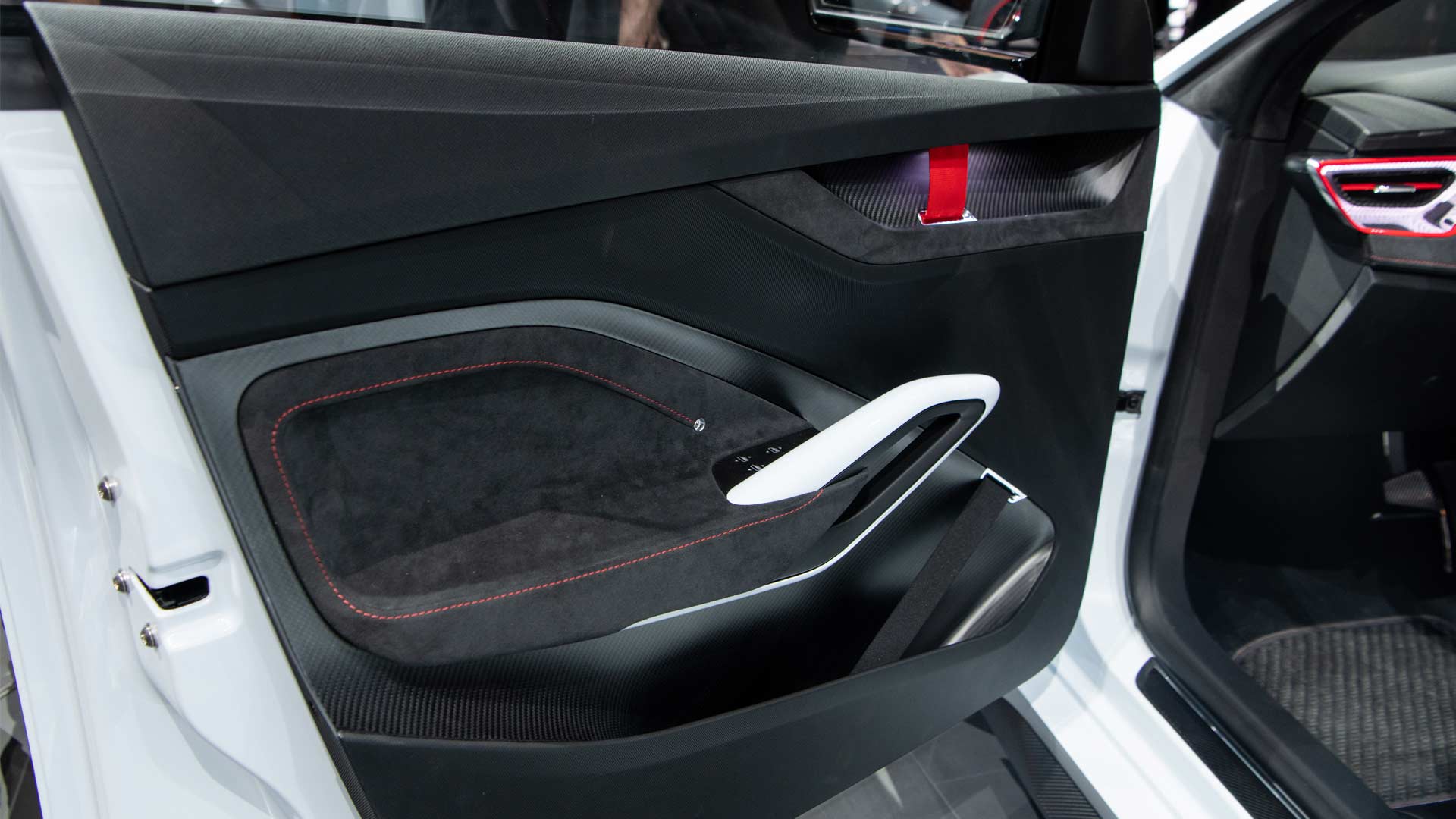 The designers have given the interiors an equally sporty touch. There are illuminated crystal glass trims which apparently are animated in interplay with the infotainment system. Also notice the red lines that flow around the instrument cluster and air vents, and the red door pull straps reminiscent of racing cars. The doors get carbon fibre inserts and the centre console is made entirely of carbon fibre. The door trims also get elastic bands to secure things in place.