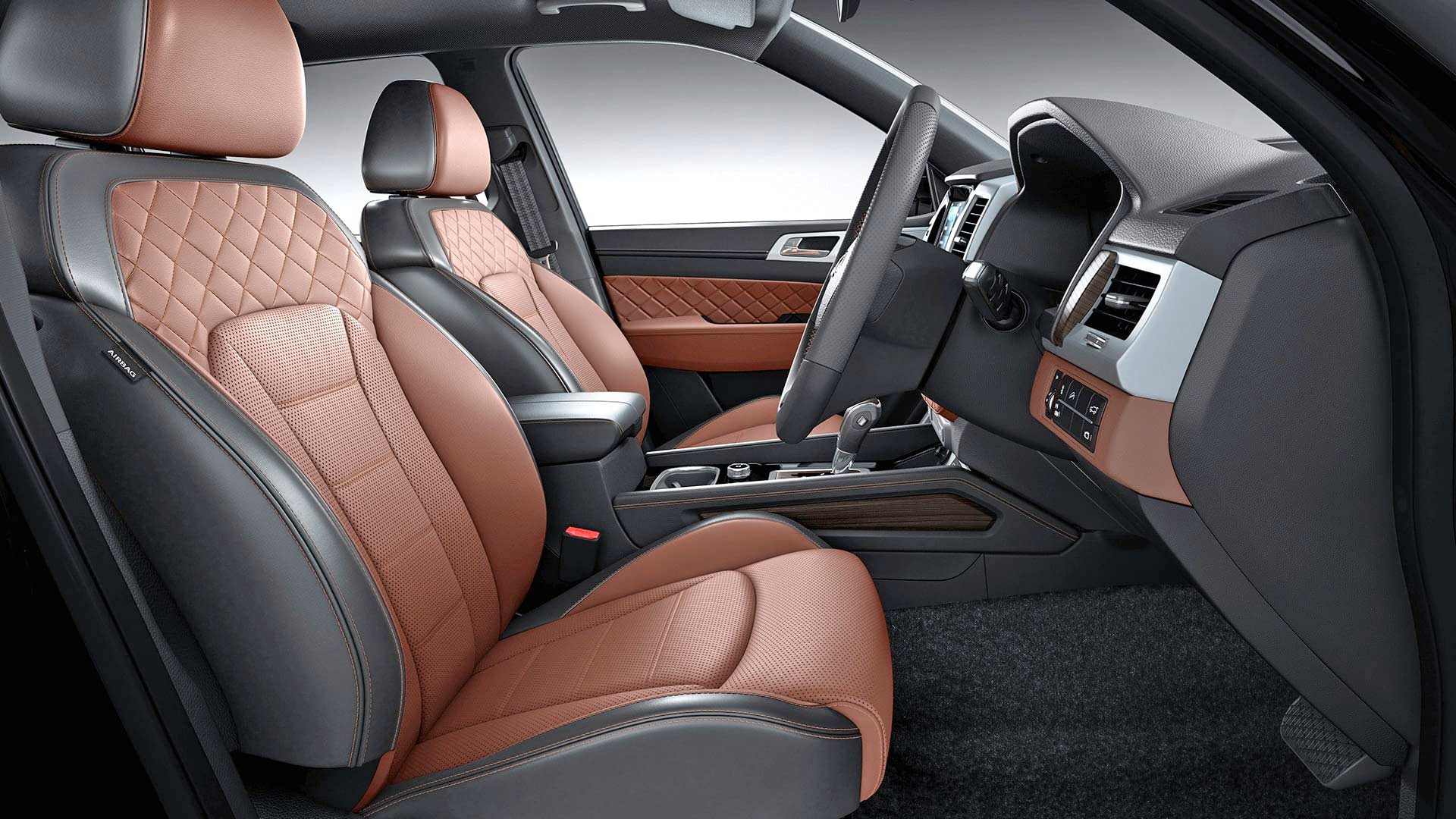 The interior layout is functional and nothing too jazzy. Depending on the variant, feature list includes dual-tone Quilted Nappa leather upholstery in Tan & Black, soft touch dashboard and door pads, 8-way power adjustable driver seat with memory, ventilated seats, dual-zone auto AC, 2nd and 3rd row AC vents, ambient lighting, tilt & telescopic adjustment for steering wheel, 2nd row USB charger, reclining 2nd row seats, rain sensing wipers, sunroof with anti-pinch, all four power windows with anti-pinch, heated ORVMs which auto-tilt while reversing, front & rear parking sensors, cruise control and powered tailgate.