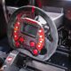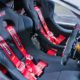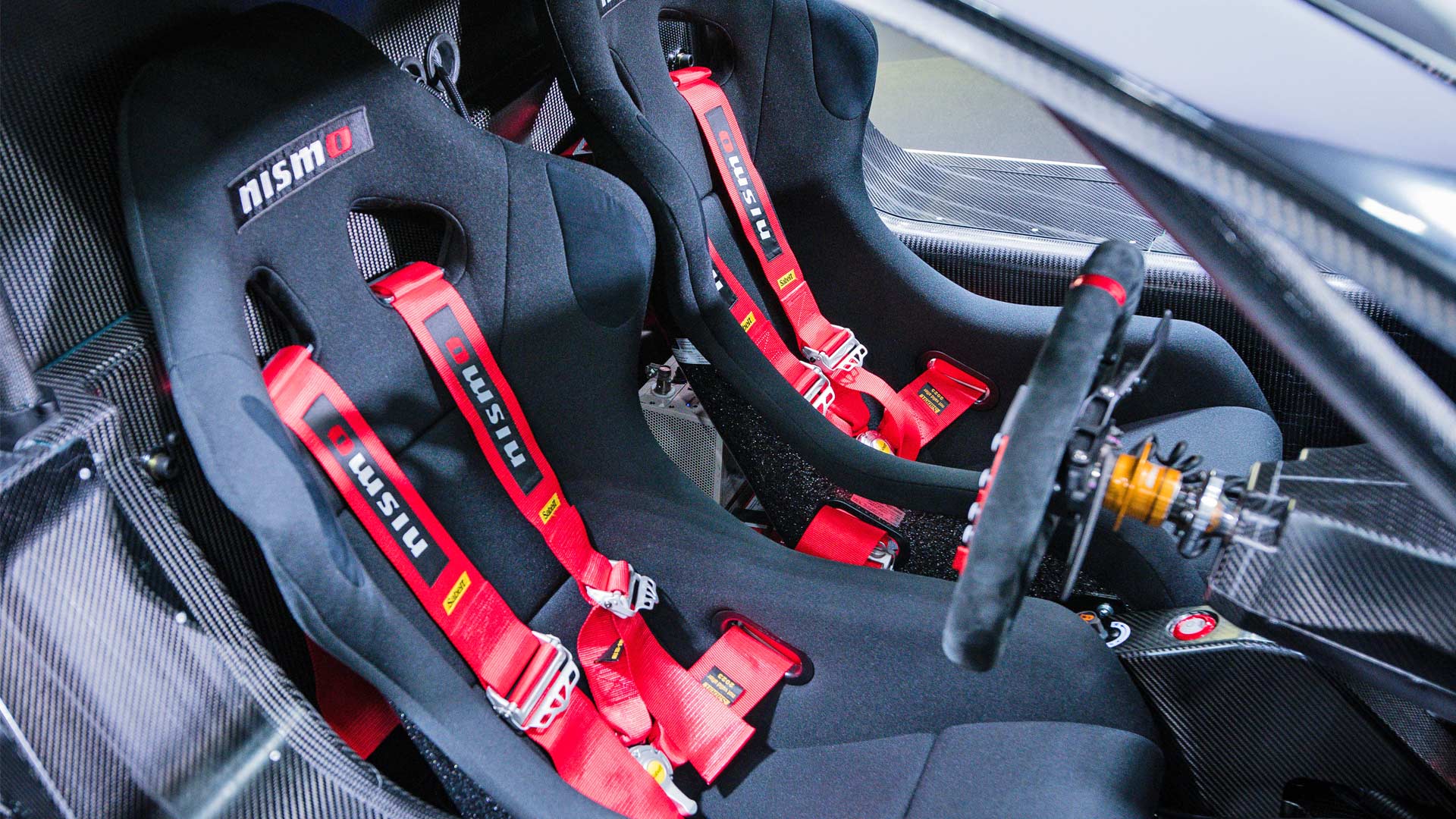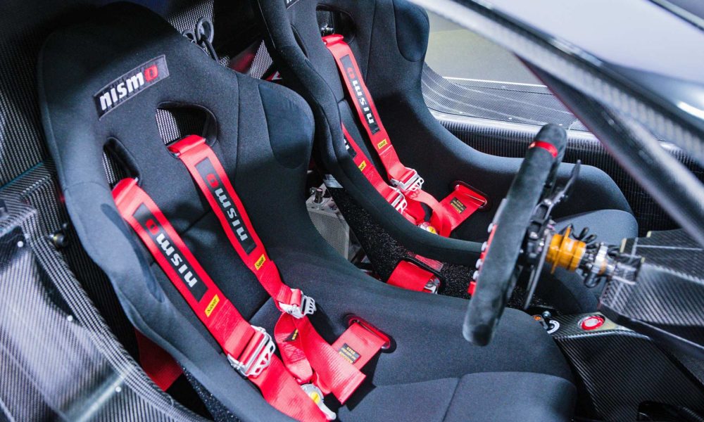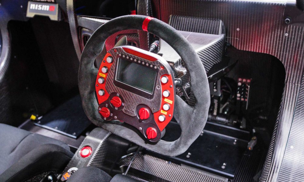 Lots of exposed carbon on the inside, typical of a track-only race car. Also notice the Alcantara-clad steering wheel with 12 o’clock red stripe.