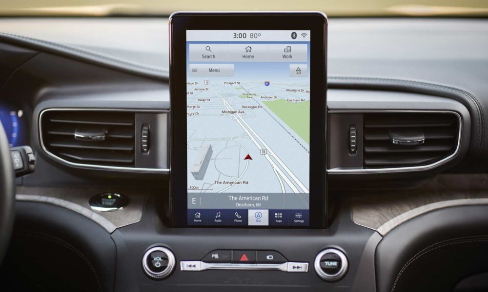 On the inside, an iPad-like 10.1-inch portrait-mounted SYNC 3 system is optional. The touchscreen shares information with the optional 12.3-inch fully digital instrument cluster. More options include Apple CarPlay, Android Auto, Waze navigation, 980-watt 14-speaker B&O premium audio system, wireless charging pad, retractable sunshades for second row, and PowerFold third-row seats.