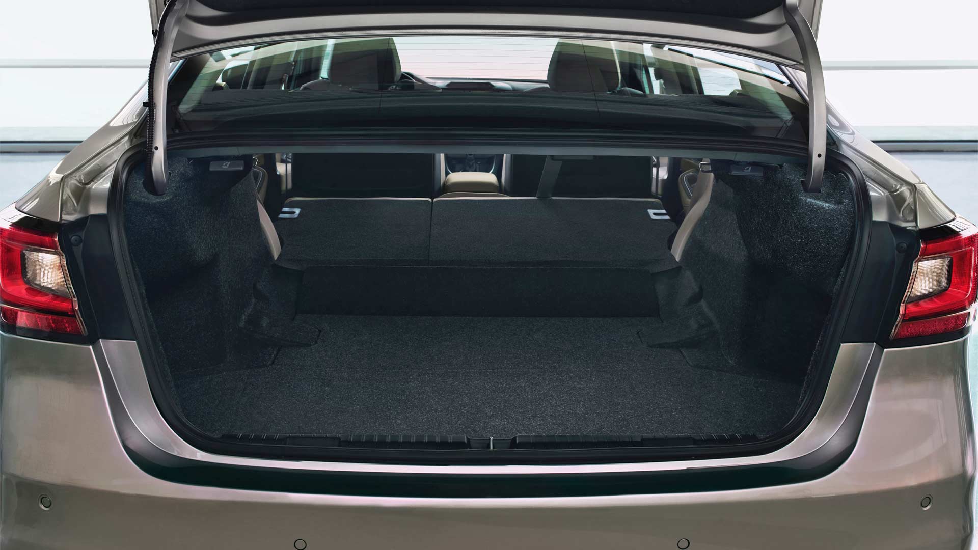 The Sport trim boasts a performance-oriented exterior that features an exclusive rear bumper, front grille with high-gloss black bar, high-gloss black ORVMs, trunk lid spoiler and dark metallic 18-inch alloy wheels.