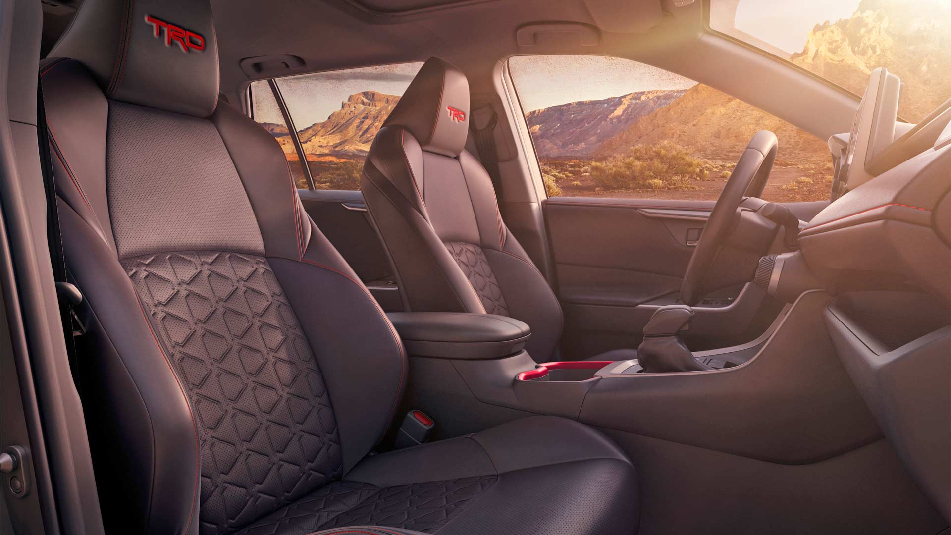 Interiors get tastefully applied red accents and red contrast stitching. Seat surfaces are covered in SofTex, which apparently is lighter than leather yet highly durable. The front seats have TRD logo stitched into the headrests. TRD all-weather floor mats and rear cargo mats round off the treatment.