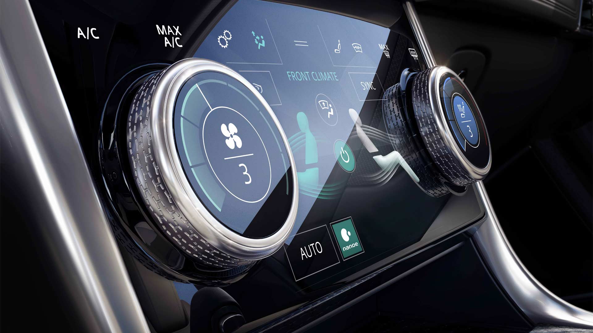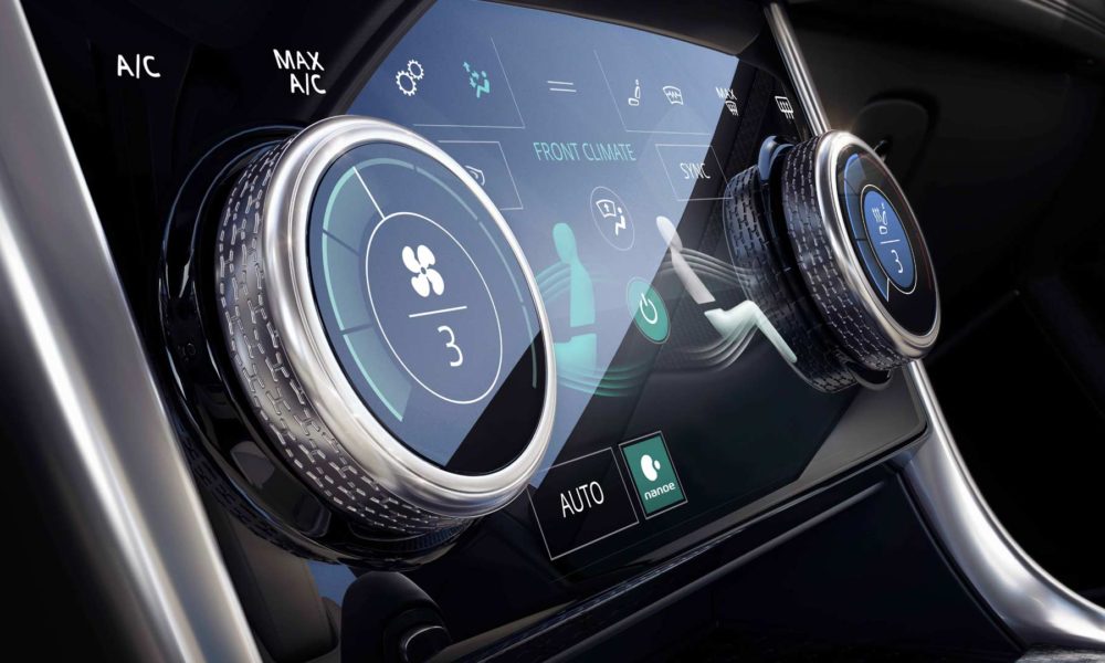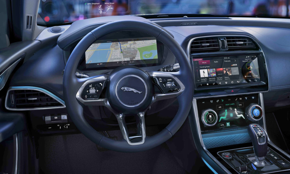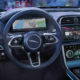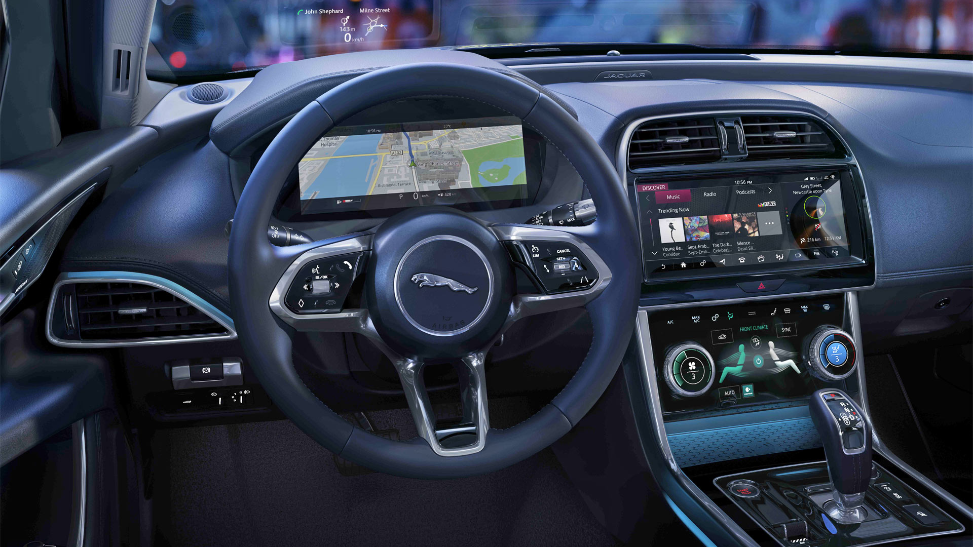 The multi-function steering wheel has also been borrowed from the I-Pace, featuring tactile switches and hidden until lit graphics. Satin Chrome gear shift paddles feature as standard.