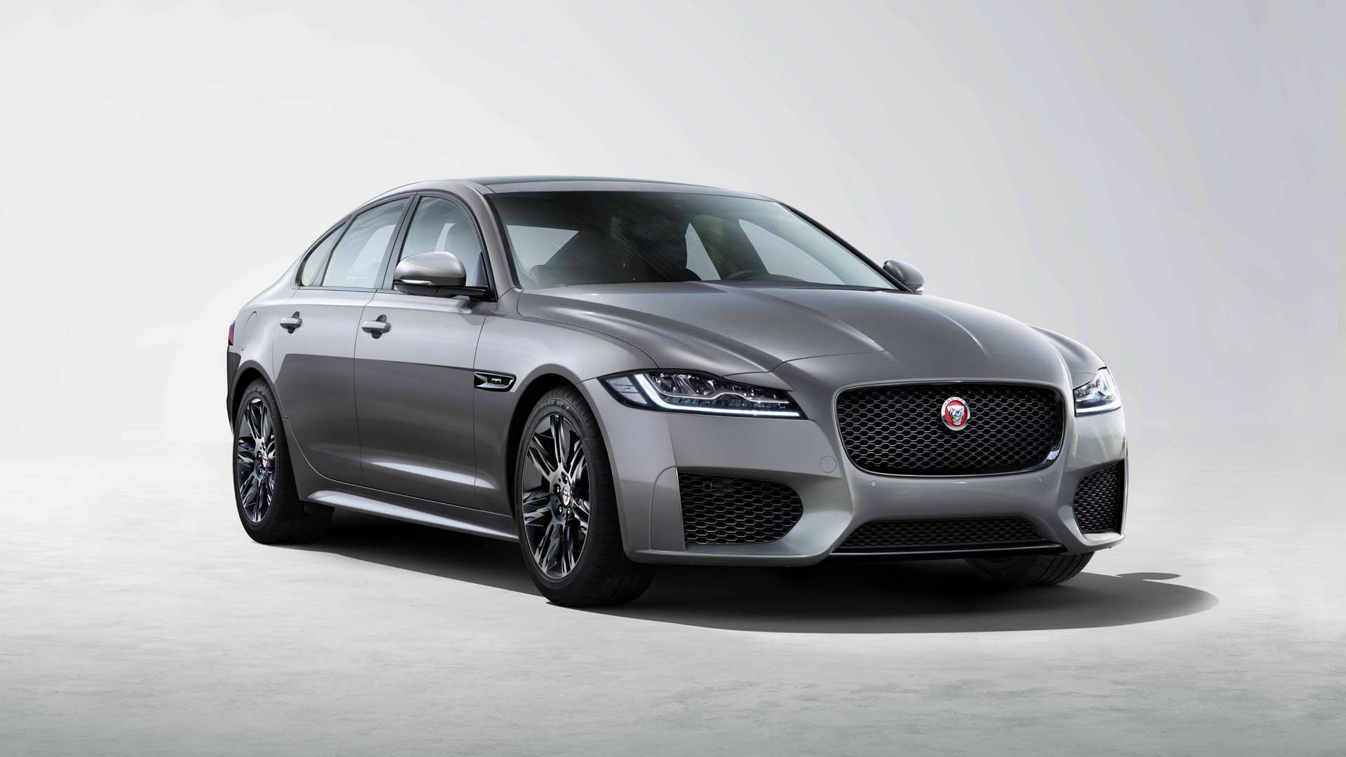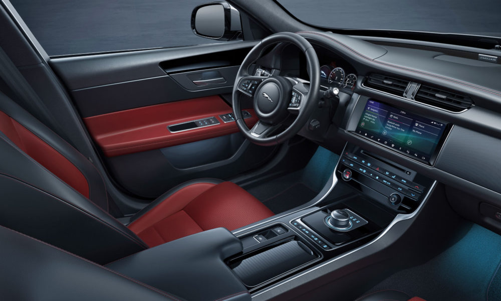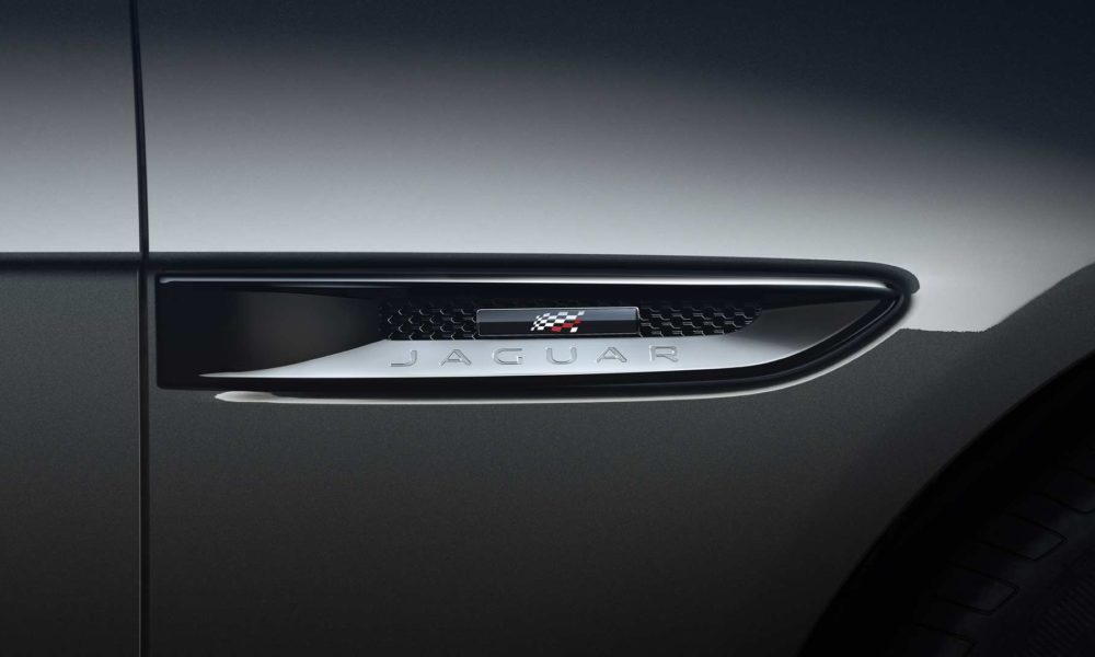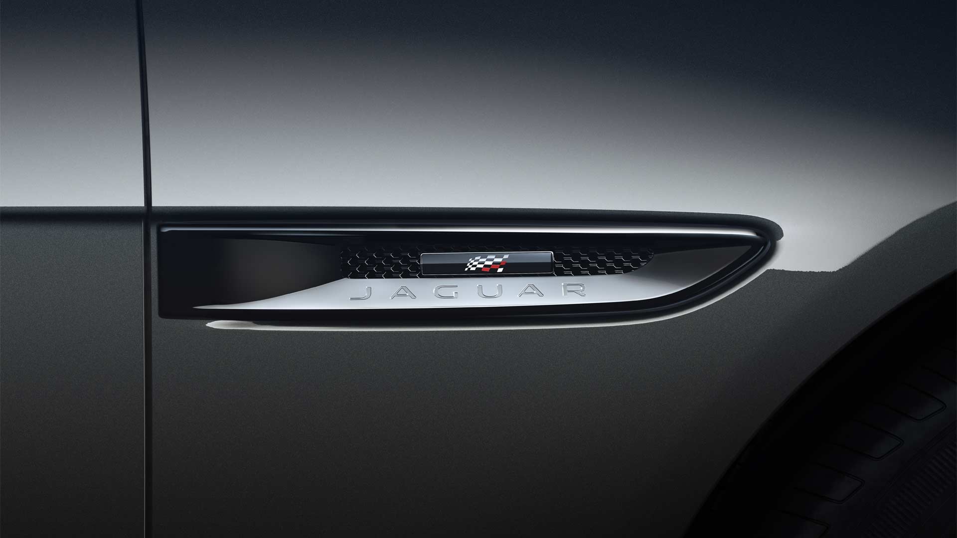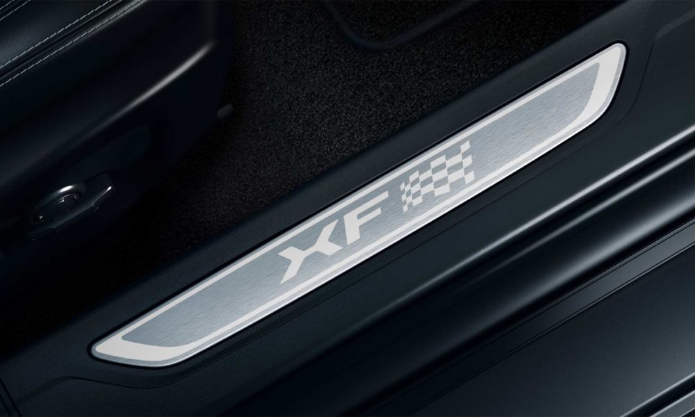 Inside, the XF Saloon and Sportbrake Chequered Flag models feature interior badging on the treadplates, Dark Hex aluminium instrument panel finisher, R-Sport full leather interior, and a choice of Jet/Jet or Jet/Red color combinations with contrast stitching.